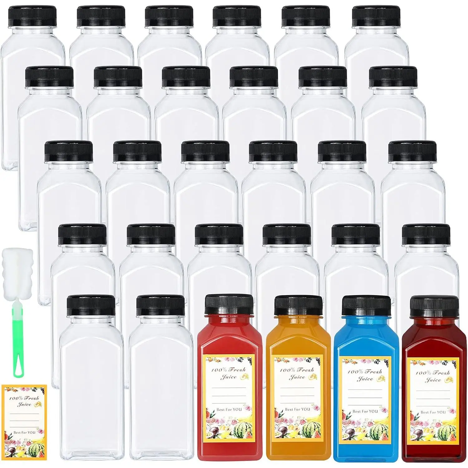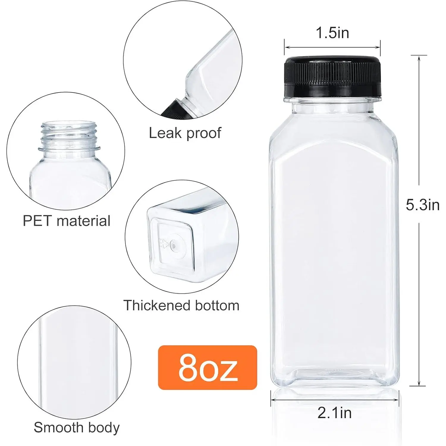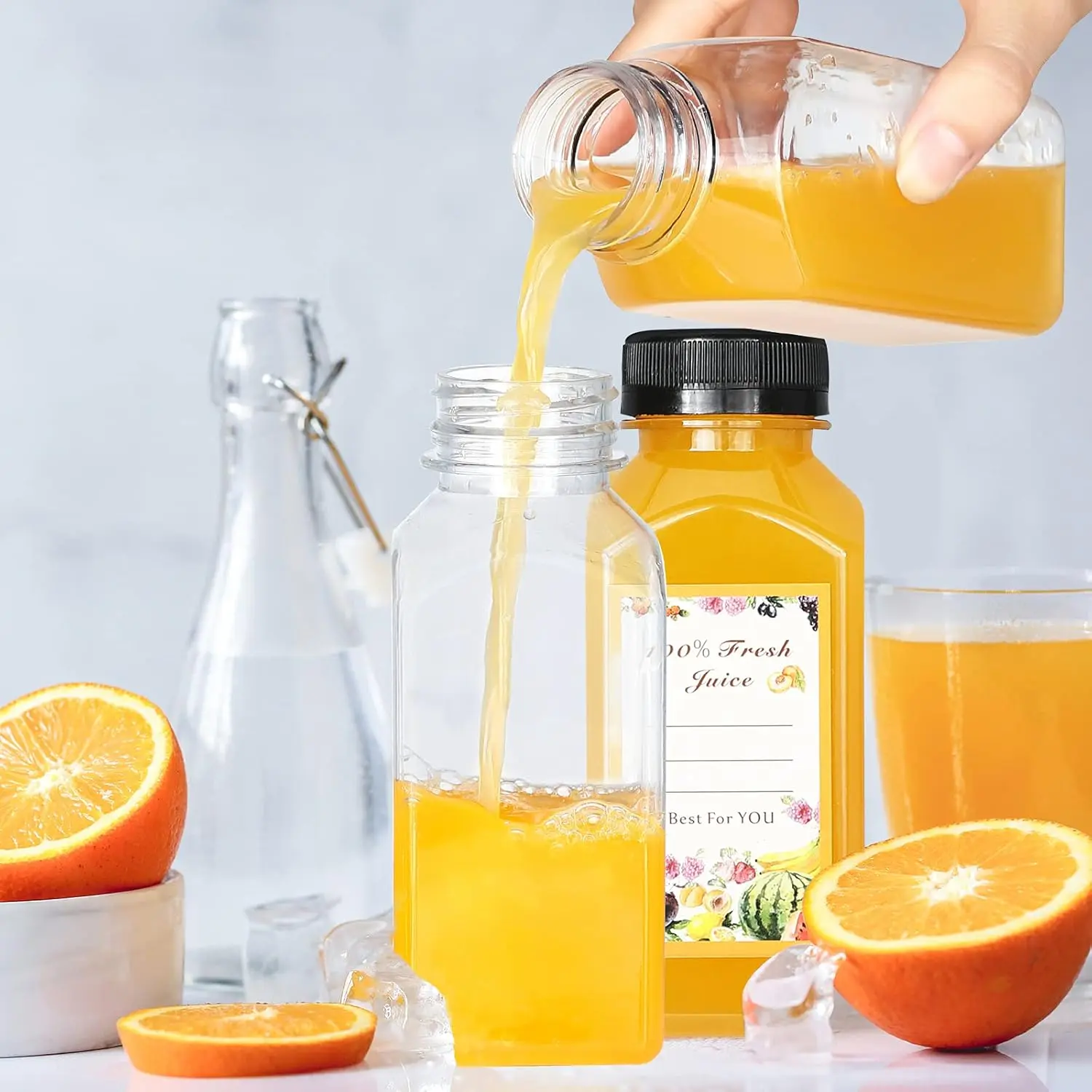 Lightweight and compact, portable to carry. Made of safe plastic material, non-toxic and odor free. Transparent clear plastic, easy for you to see the contents of the bottle. Made of food-grade PET material, very durable and can be reused many times. Plastic juice bottles with lids have a good sealing function, it can prevent leakage.