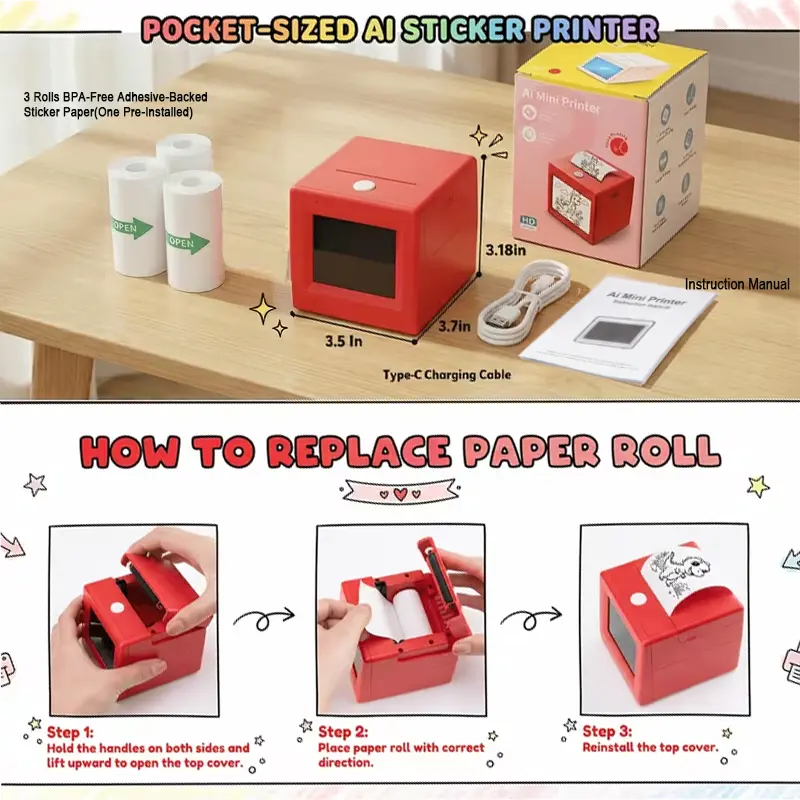 ·【Portable Inkless Sticker Maker】Inkless portable sticker maker delivers fast, clean printing without ink or toner. Compact and lightweight, the mini stickerbox printer is easy to carry anywhere. This portable ai sticker printer works great for labeling, organizing, and DIY projects anytime, anywhere.