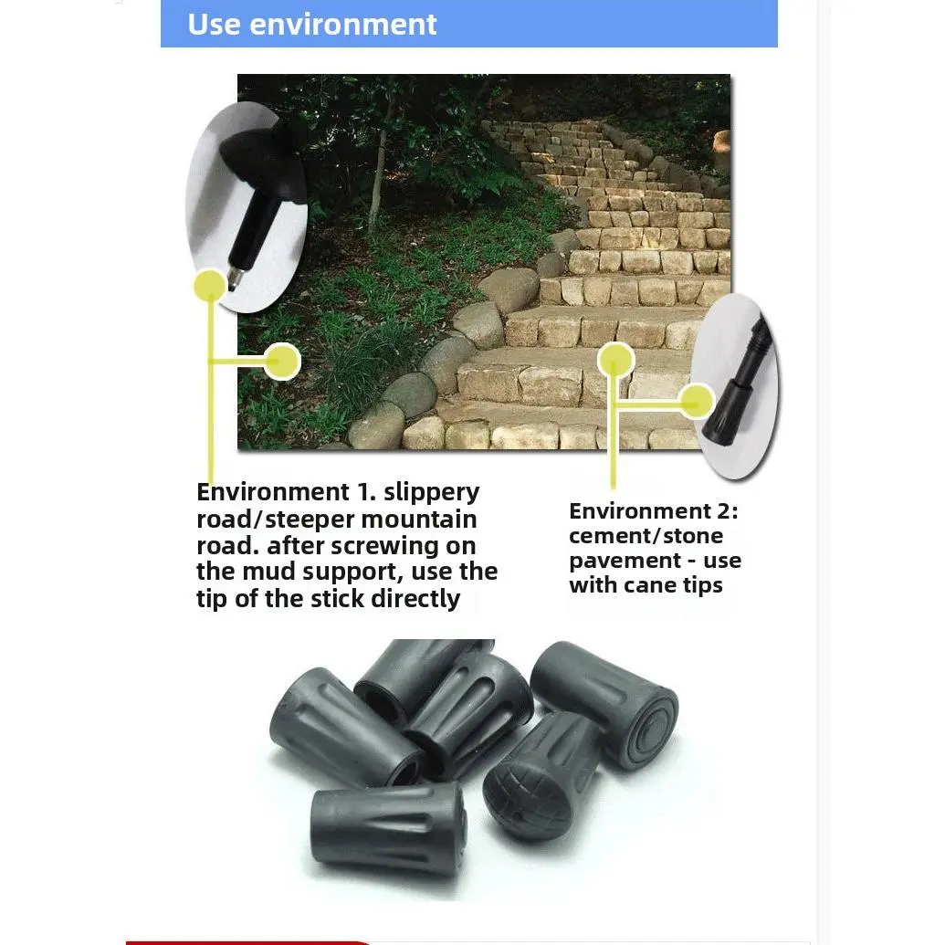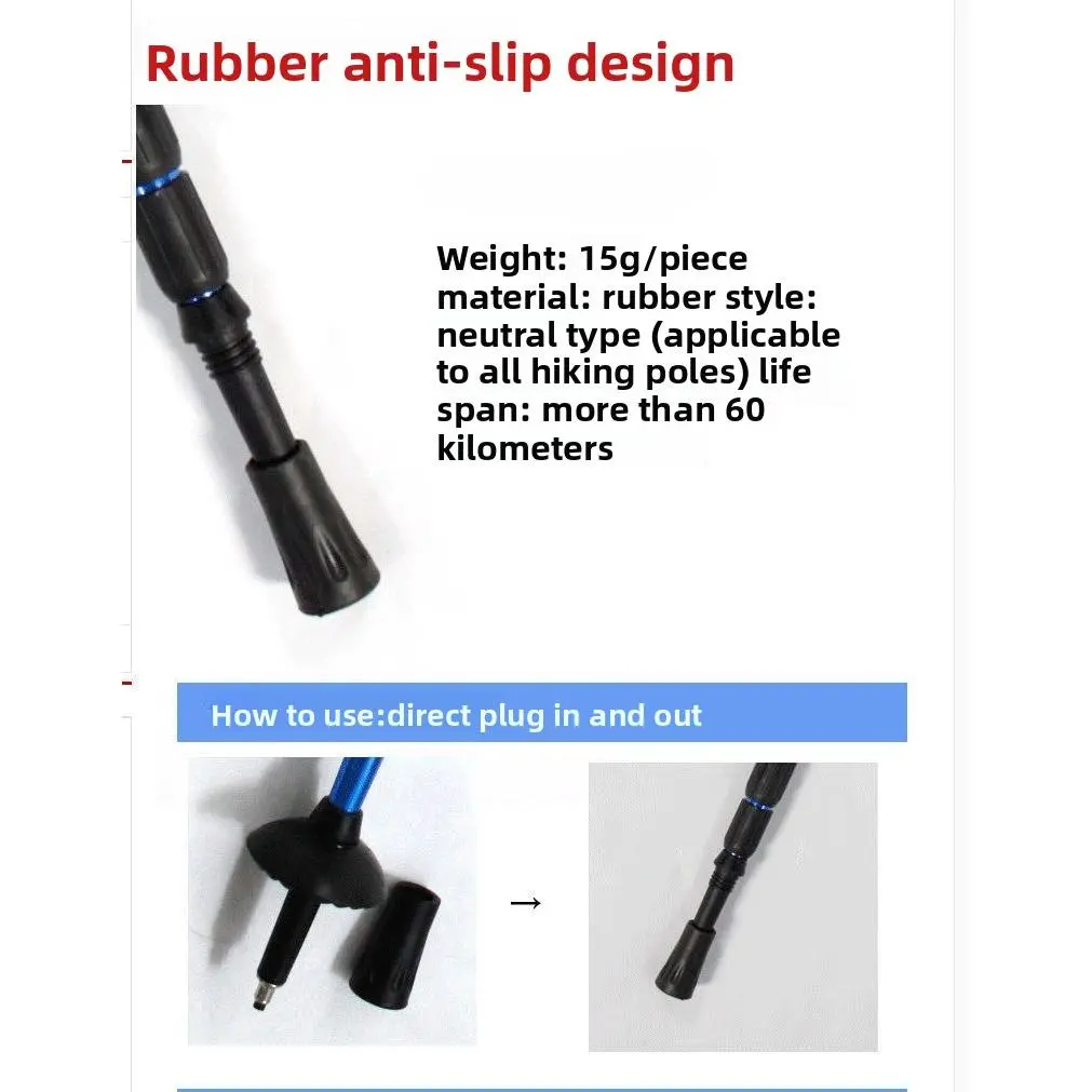 Premium Trekking Pole Rubber Tips These durable rubber ferrules are essential accessories for hiking, trekking, and walking poles, designed to enhance traction, protect your poles, and adapt to diverse terrains.Crafted from high-quality, wear-resistant rubber, they deliver superior grip on smooth, hard surfaces like concrete, stone, and pavement, preventing slips and reducing noise while protecting the pole's metal tip from wear and tear. Ideal for wet, slippery mountain trails, simply attach the mud basket and use the sharp metal tip for maximum penetration and stability on soft, uneven ground. The universal fit is compatible with most standard 16mm trekking poles, offering easy installation and reliable performance. Lightweight and long-lasting, these rubber tips ensure safe, comfortable trekking across all environments, making them a must-have for outdoor enthusiasts.