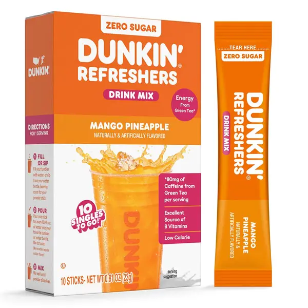 Dunkin’ Zero Sugar Refreshers Singles To Go! offers a convenient variety pack of 30 single-serve packets. Each box contains 30 servings, making it ideal for quick refreshments. Simply add water to enjoy a flavorful drink. Energy from green tea powers each packet, providing a natural boost.