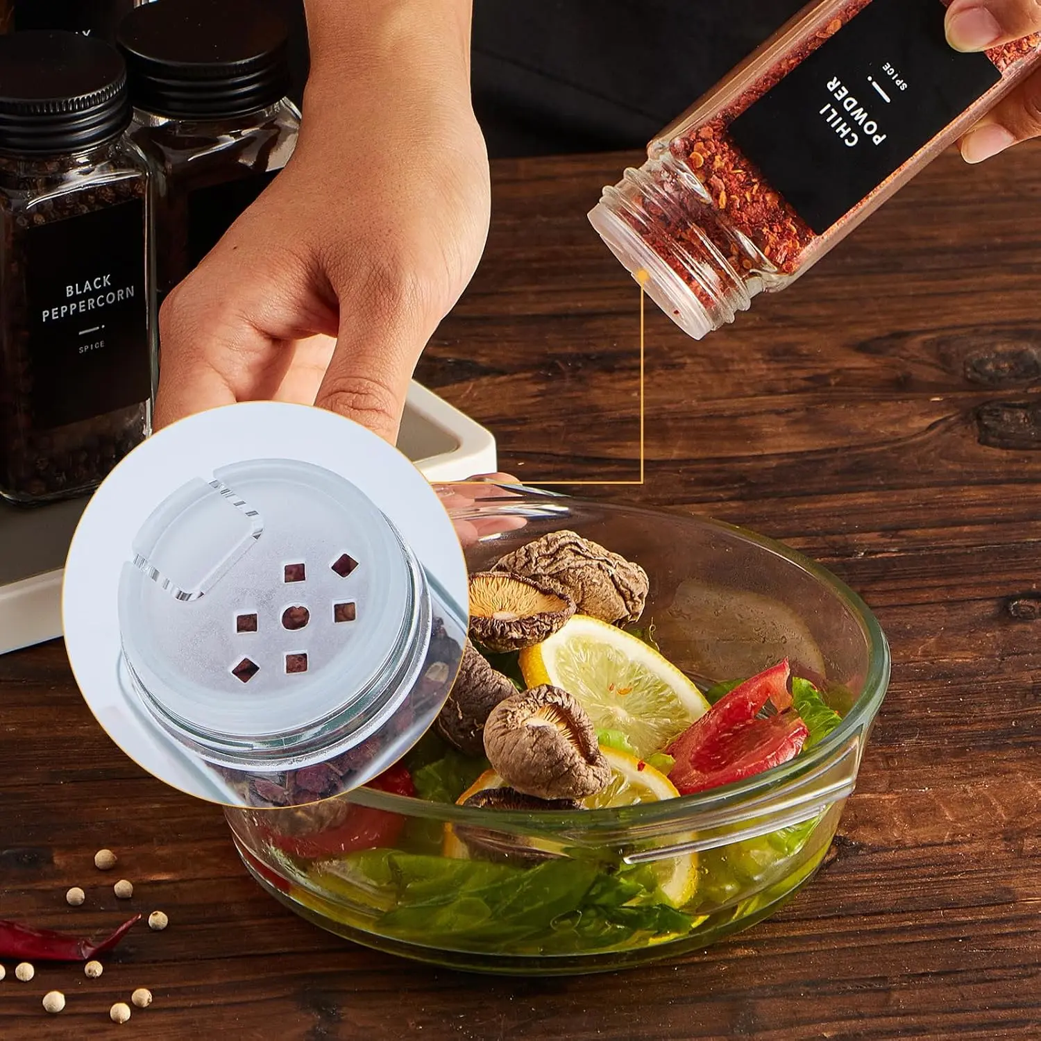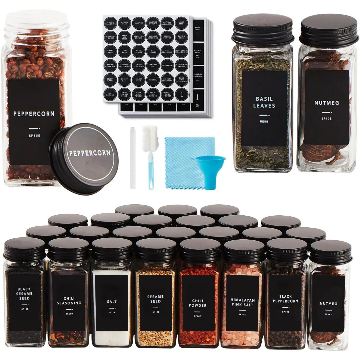 25 Pcs Spice with Label- Glass Spice with Black Metal Caps,Shaker Lids, Funnel, Chalk Pen, Brush,Cleaning Cloth 4oz Seasoning Containers Bottles for Spice Rack, Cabinet, Drawer