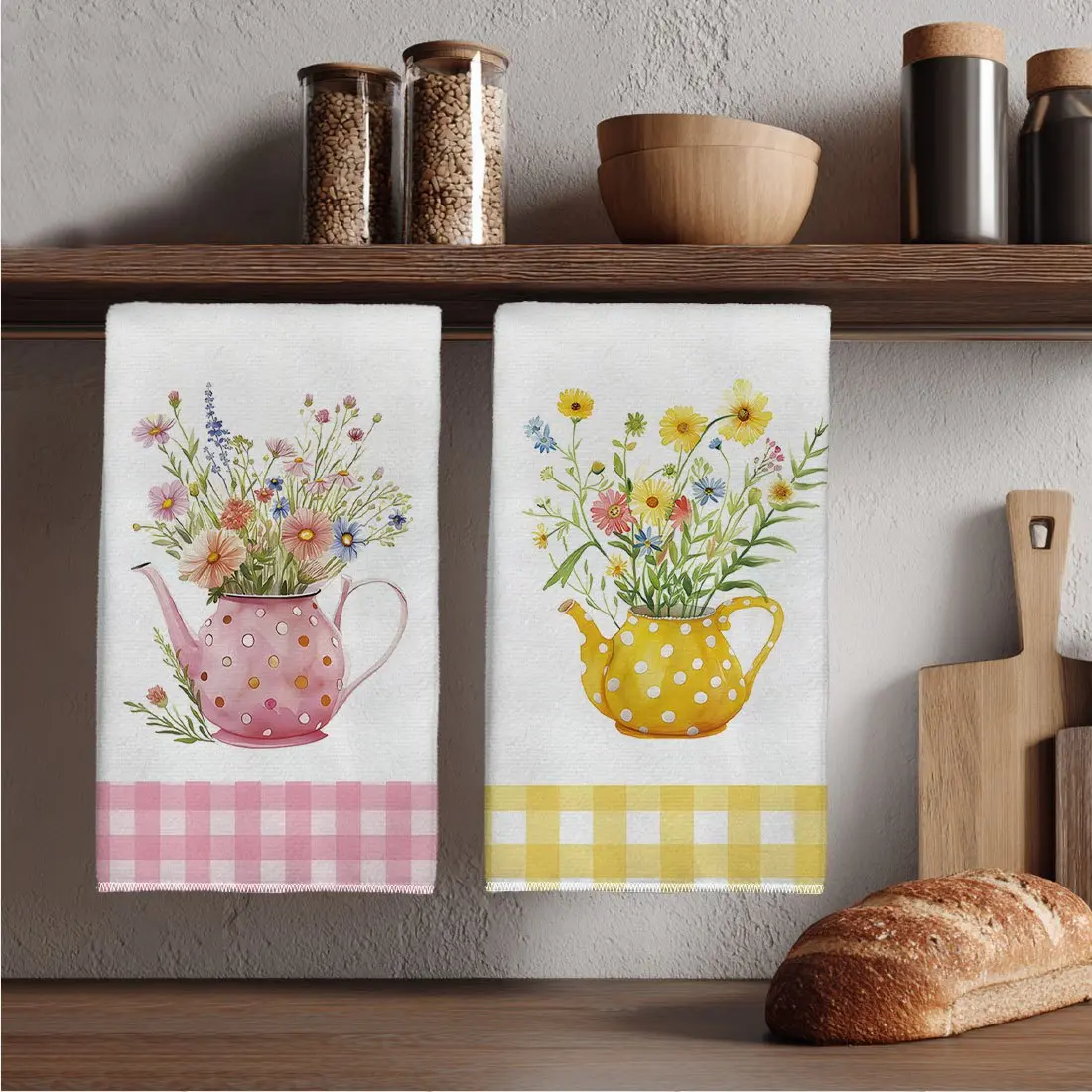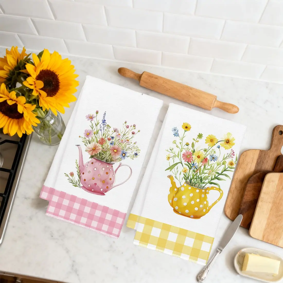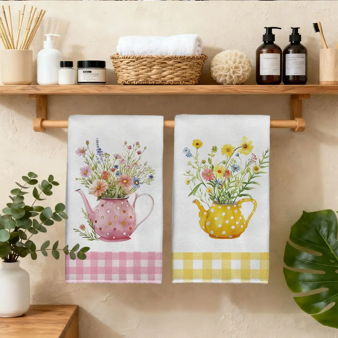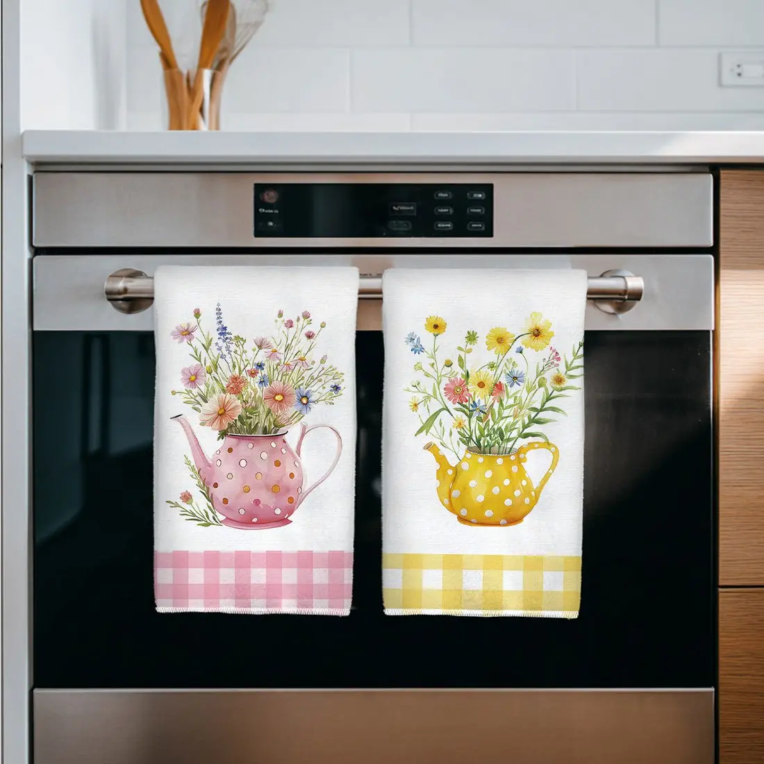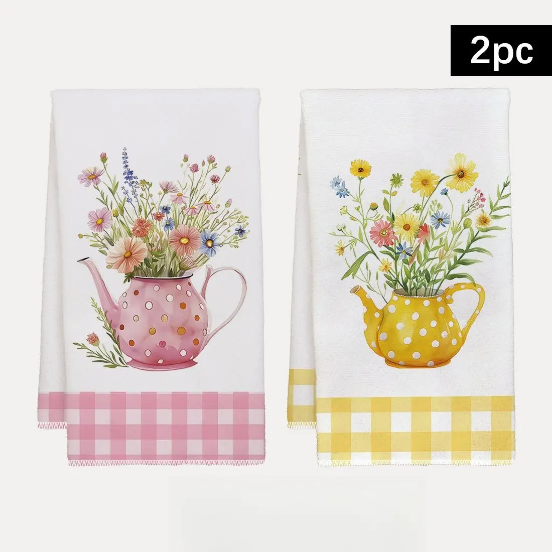 2pcs 23.6x15.7 In Spring Watercolor Style Kitchen Towel Set Yellow And Pink Checkered Polka Dot Kettle Floral Pattern Dishcloth Scouring Pad Tea Set Decoration Suitable For Living Room And Kitchen Tea Towel And Dish Towel Warm Spring
