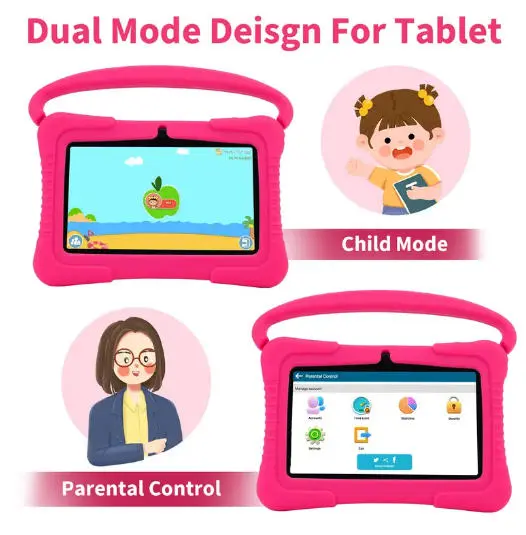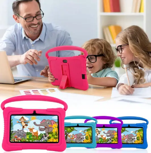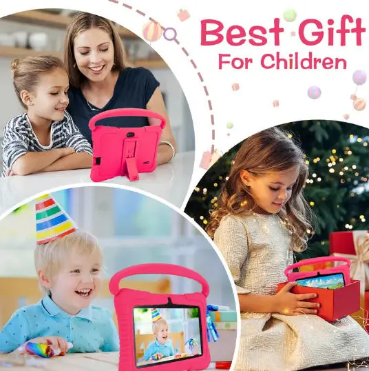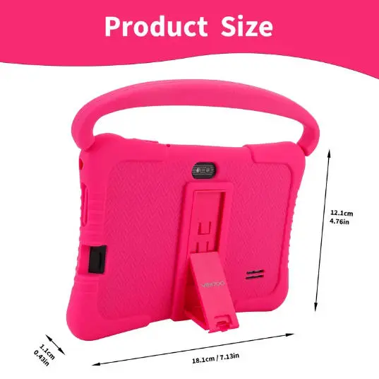 Discover the Veidoo 7 inch Kids Tablet, perfect for toddlers! It features a 2GB+32GB storage capacity and WiFi connectivity. The IPS screen ensures clear visuals. Ideal for learning and entertainment, this tablet comes with parental control for safety. Choose from a pink silicone case or a blue one.