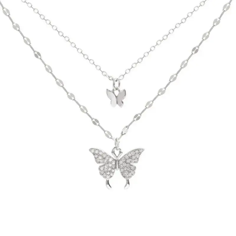 Exquisite Cute Women's Lats Sparkling Butterfly Necklace Double Layer Collar Chain Jewelry Banquet Party Holiday Gift for Girls