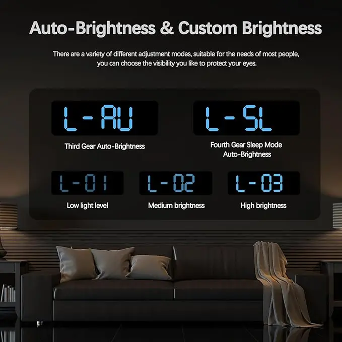 ·【Auto Dimming】You can manually adjust the brightness by 10-levels. The digital wall clock has an auto dimming function; When turned on, the brightness will auto decrease at night, not to disturb your sleep.