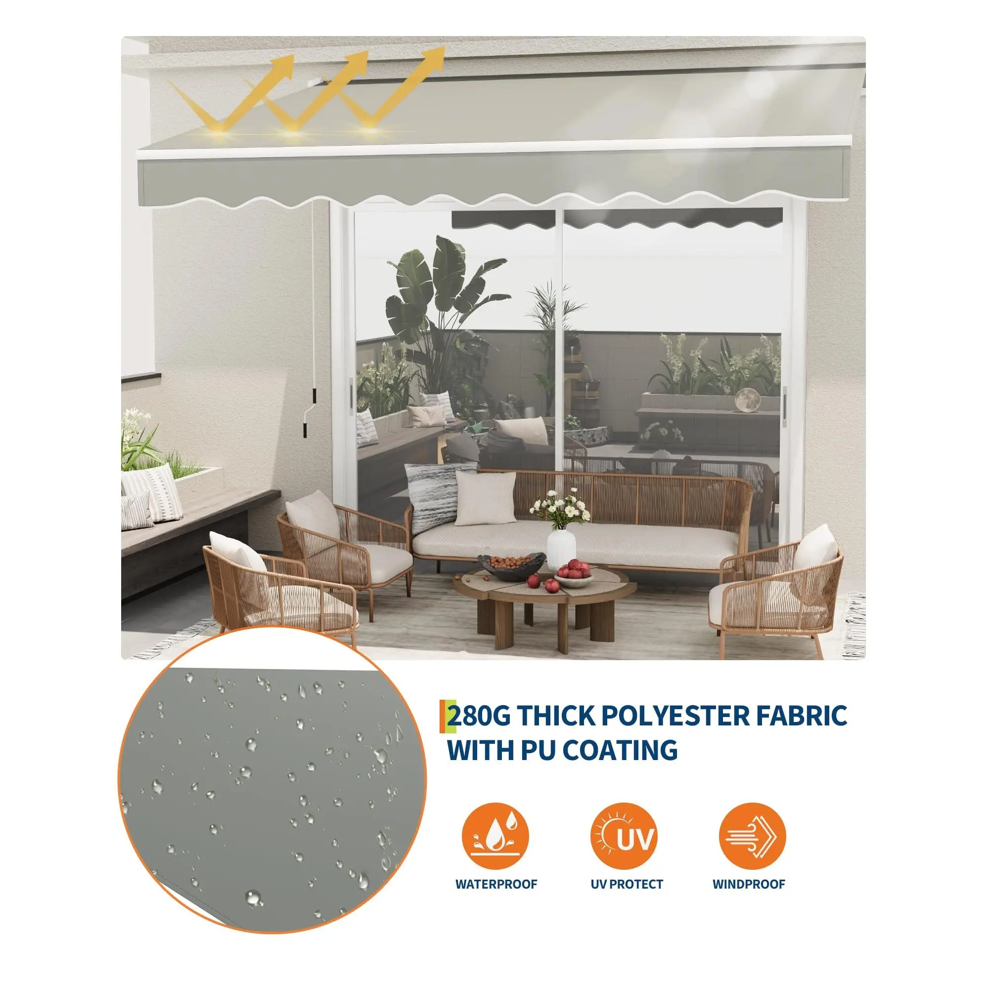 Superior Waterproof & UV Protection: The awning is crafted from 280 g/㎡ polyester fabric with PU coating, providing effective waterproofing and UV50+ sun protection — making it a reliable waterproof retractable awning for your deck or patio.