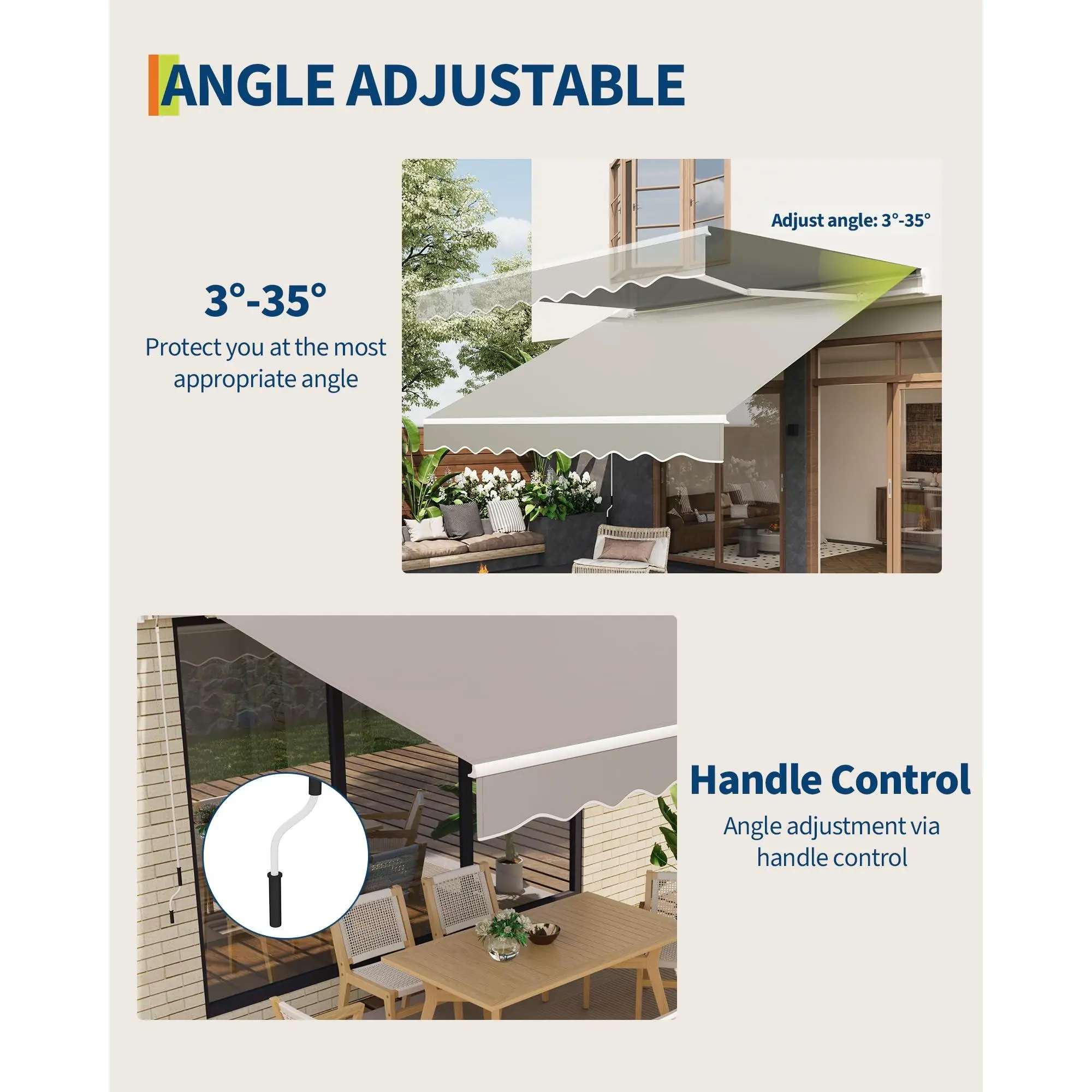 Easy Manual Operation & Flexible Use: Featuring a 5 ft manual awning crank handle, this manual retractable awnings for patio allows smooth 5-35° angle adjustment and effortless roll out or retraction for optimal shade at any time.