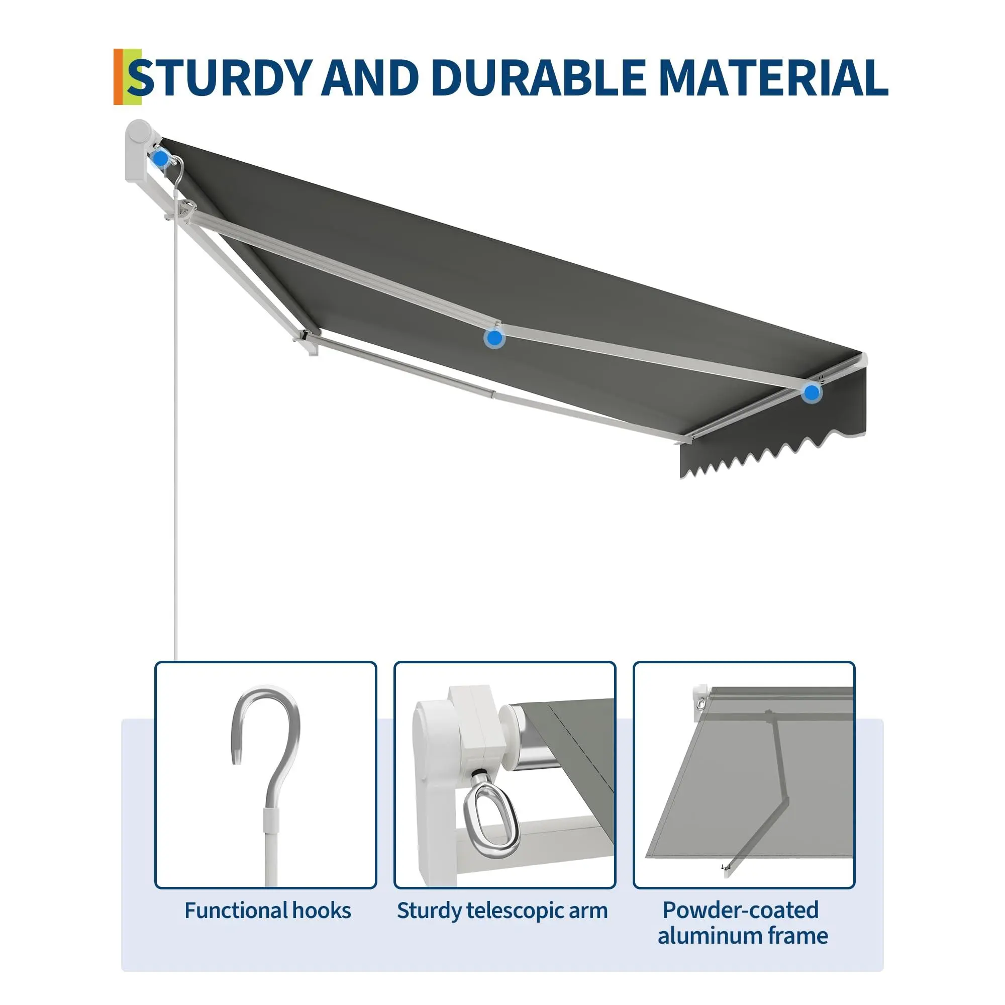 Heavy-Duty Frame for Stability: Featuring a reinforced aluminum frame and double steel wire arms, this retractable awning offers reliable strength and lasting support for your patio or deck in any season.