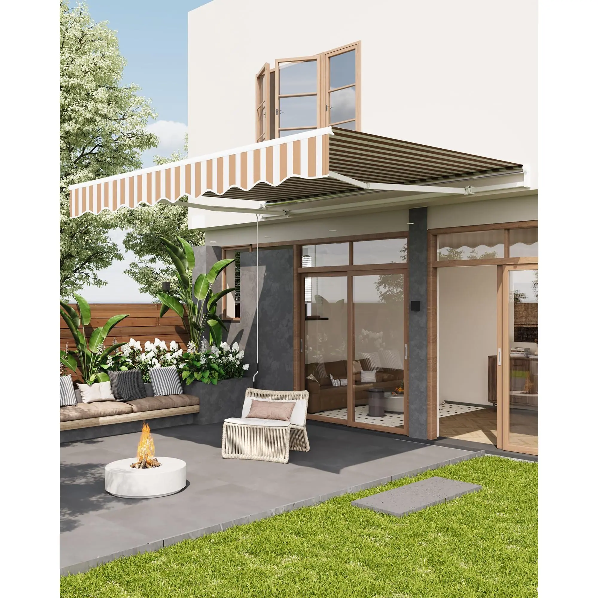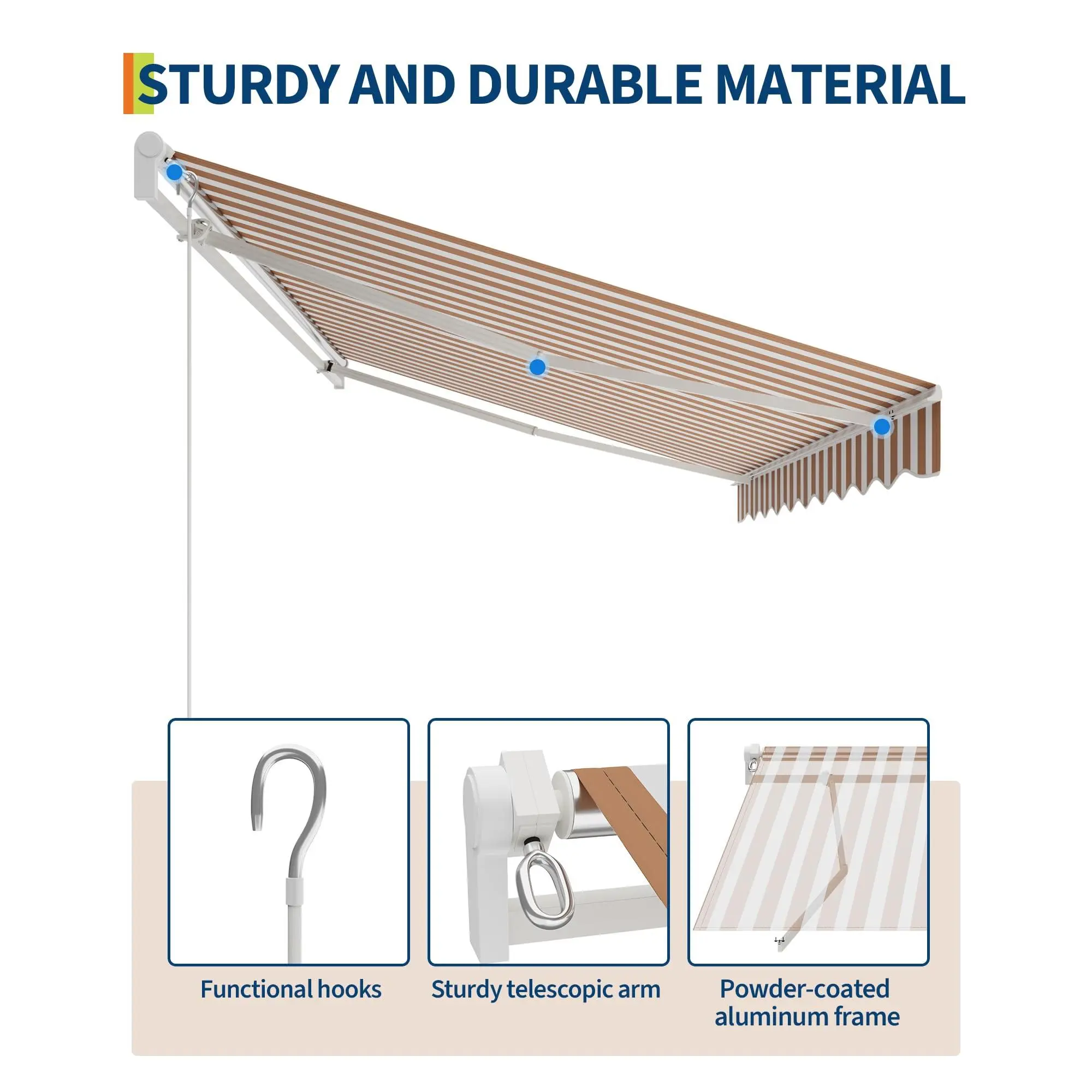 Heavy-Duty Frame for Stability: Featuring a reinforced aluminum frame and double steel wire arms, this retractable awning offers reliable strength and lasting support for your patio or deck in any season.
