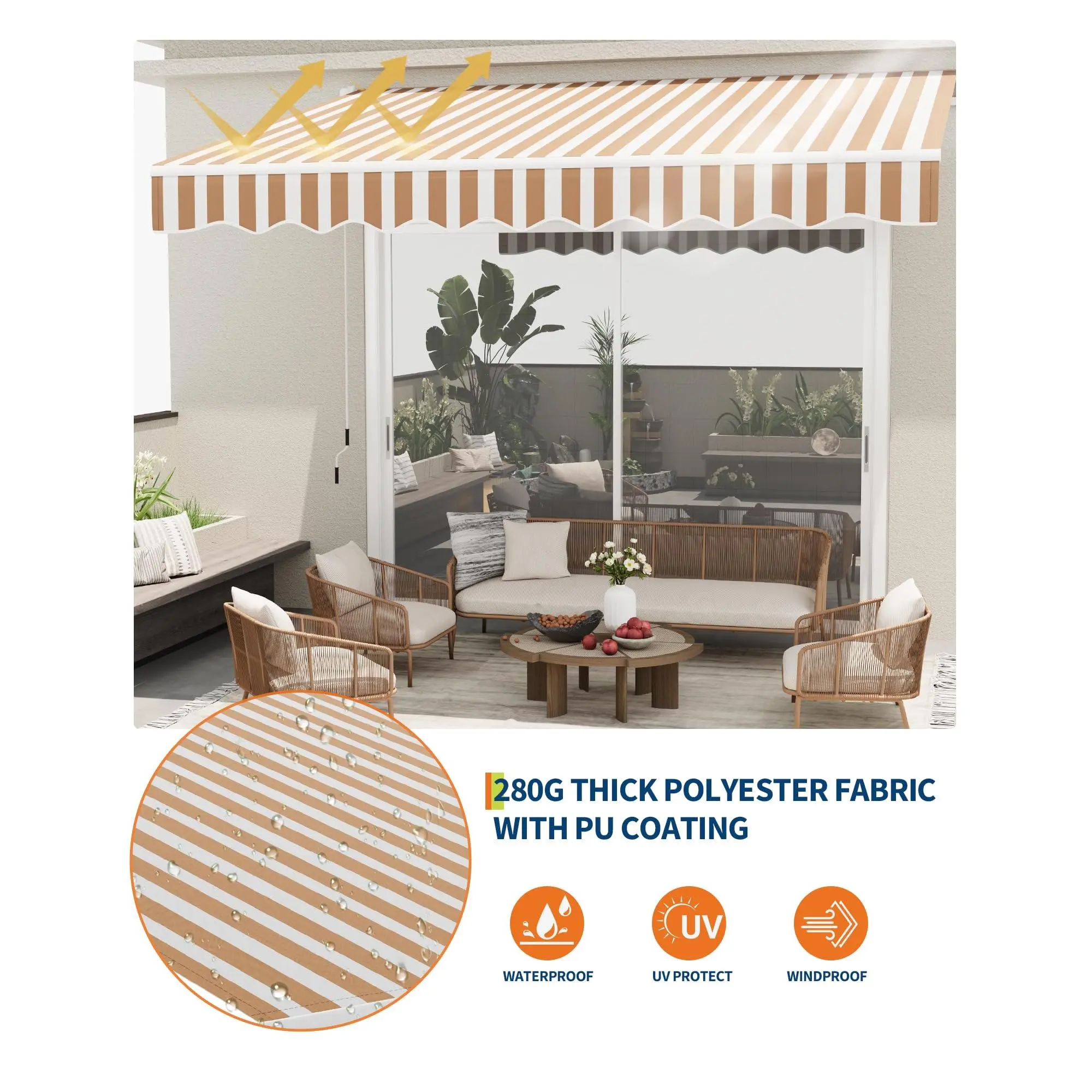 Superior Waterproof & UV Protection: The awning is crafted from 280 g/㎡ polyester fabric with PU coating, providing effective waterproofing and UV50+ sun protection — making it a reliable waterproof retractable awning for your deck or patio.