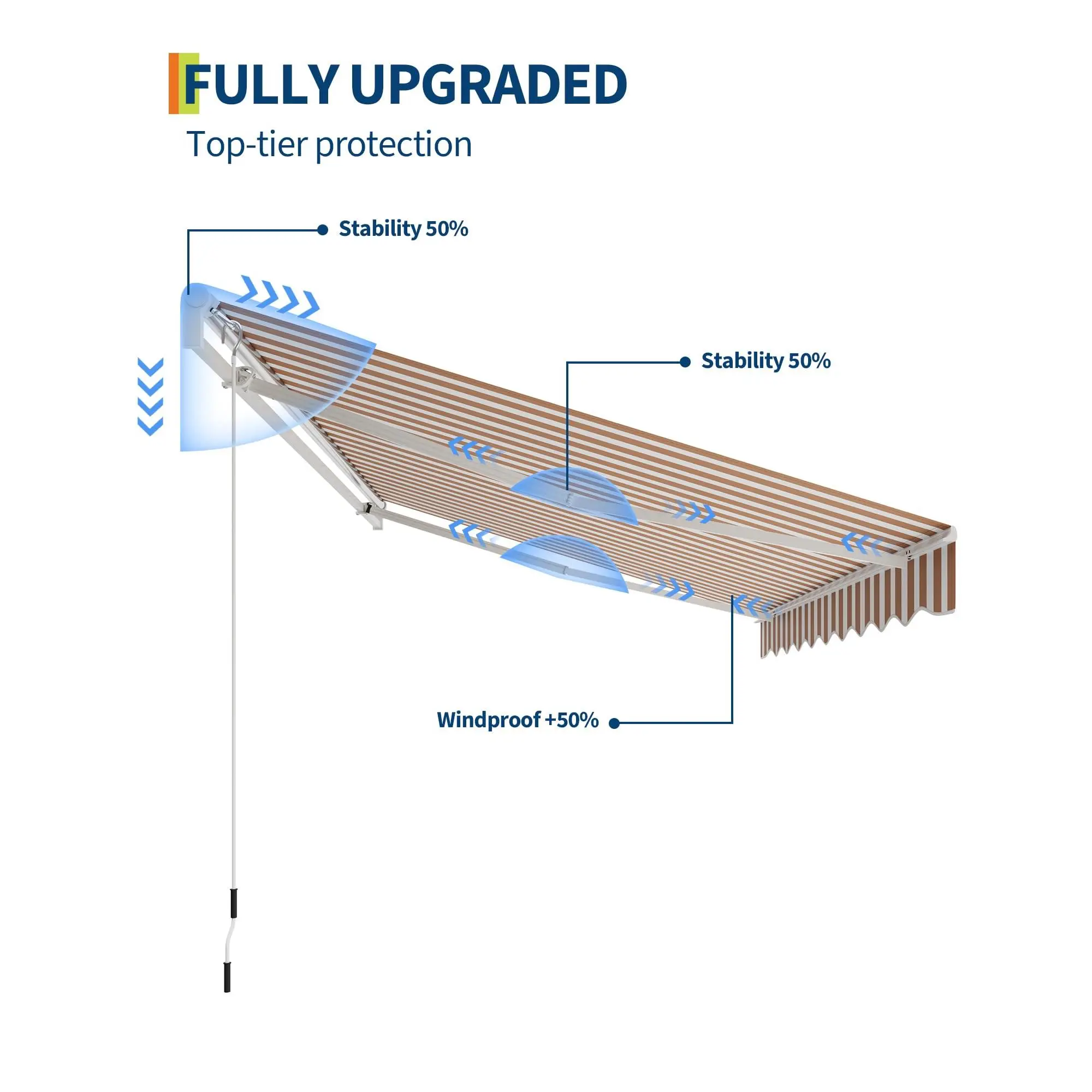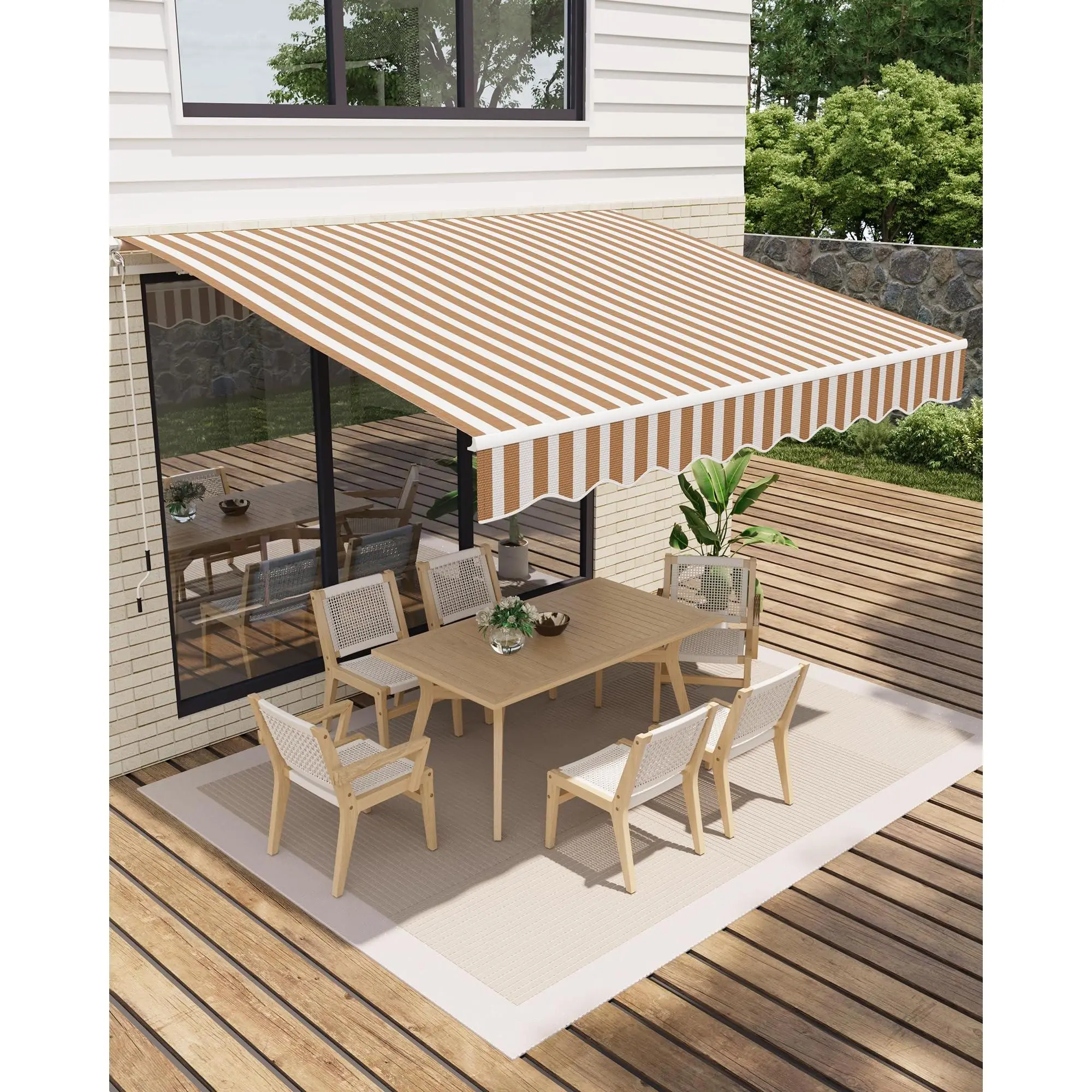 Quick Assembly & Secure Installation: Comes with pre-installed double steel wire arms, corrosion-resistant aluminum hardware, and detailed instructions, reliable installation of your retractable deck awning at home.