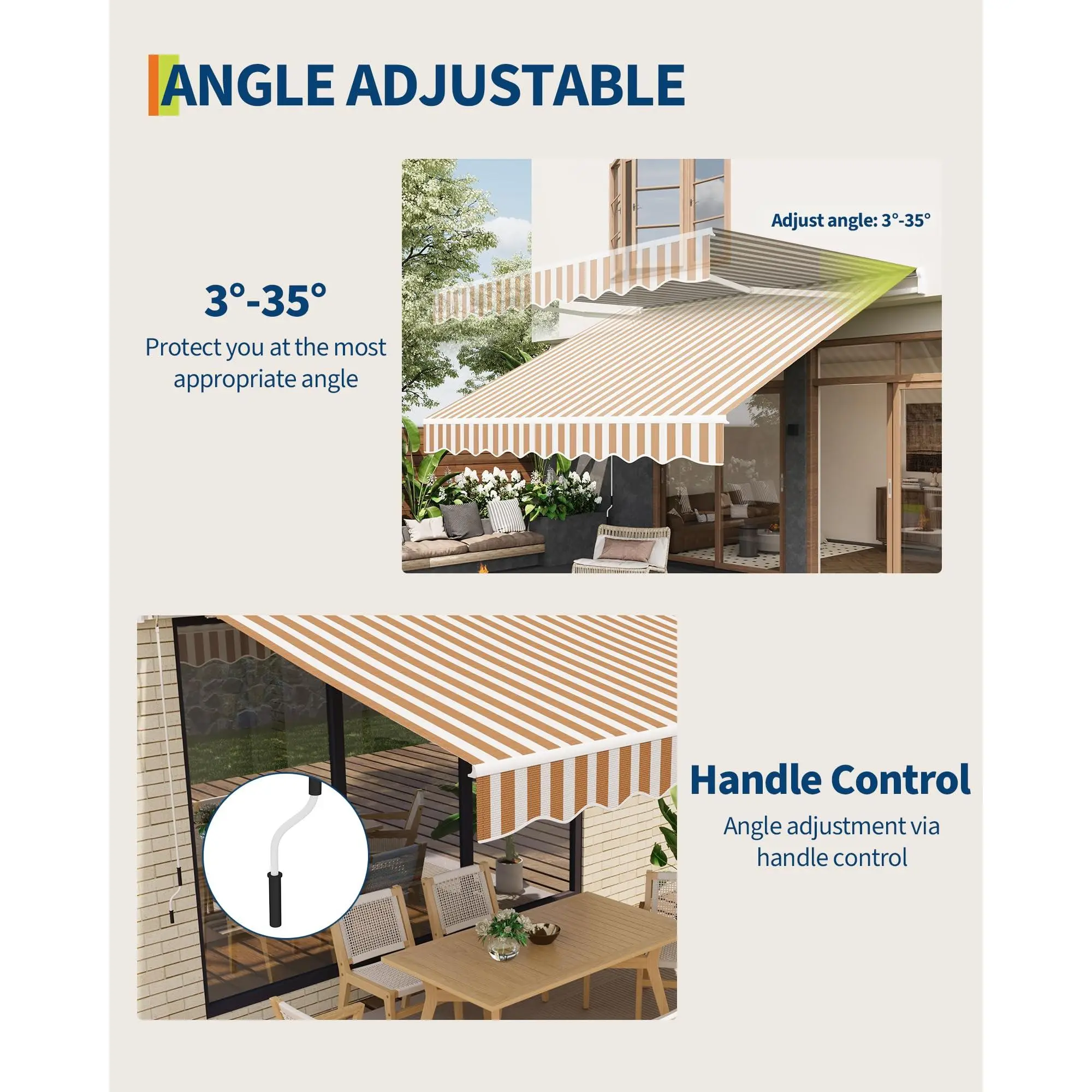 Easy Manual Operation & Flexible Use: Featuring a 5 ft manual awning crank handle, this manual retractable awnings for patio allows smooth 5-35° angle adjustment and effortless roll out or retraction for optimal shade at any time.
