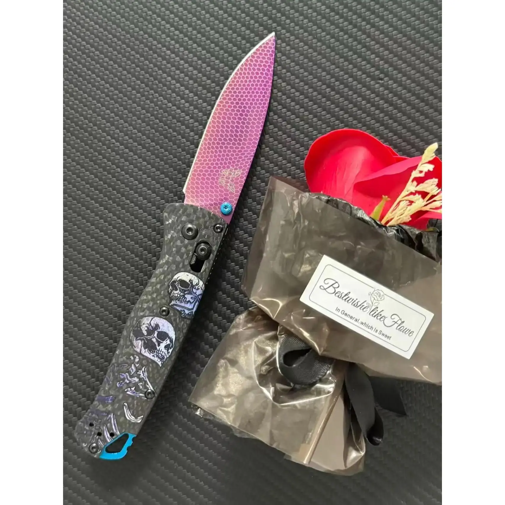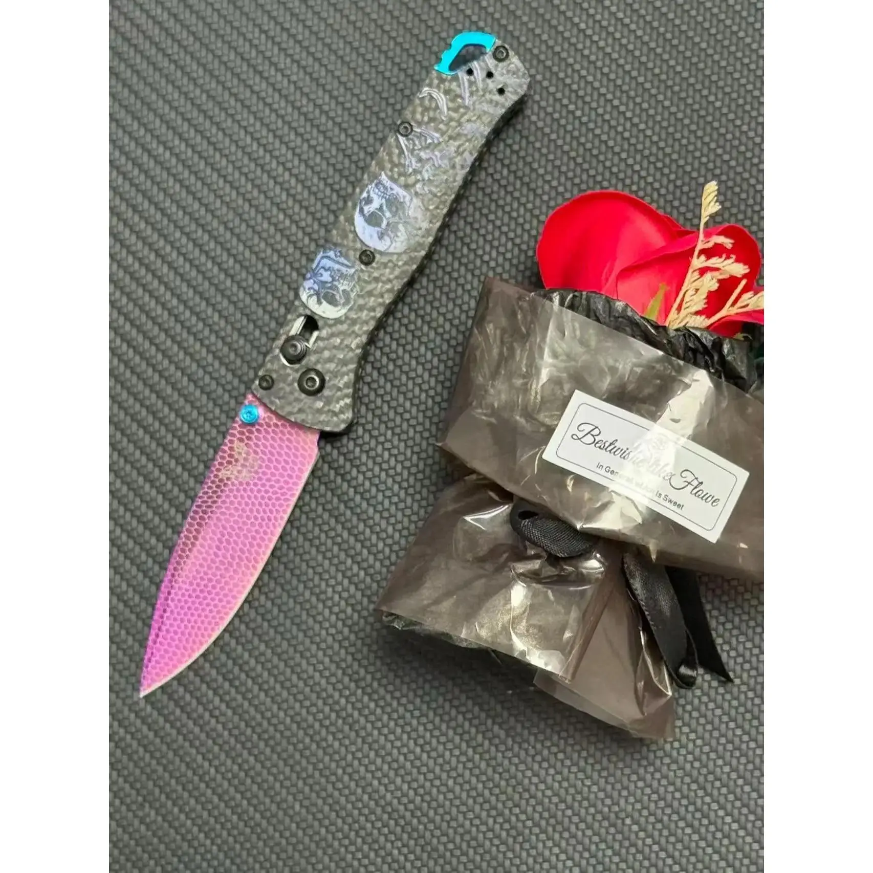 535 Outdoor Multi-Tool, carbon-fused handle, 3D-printed skull texture, laser-etched patterns with vibrant hues, vacuum-coated to achieve a titanium-like purplish-red finish, made of high-hardness Damascus steel