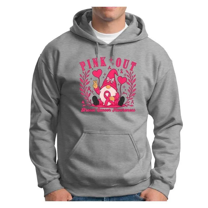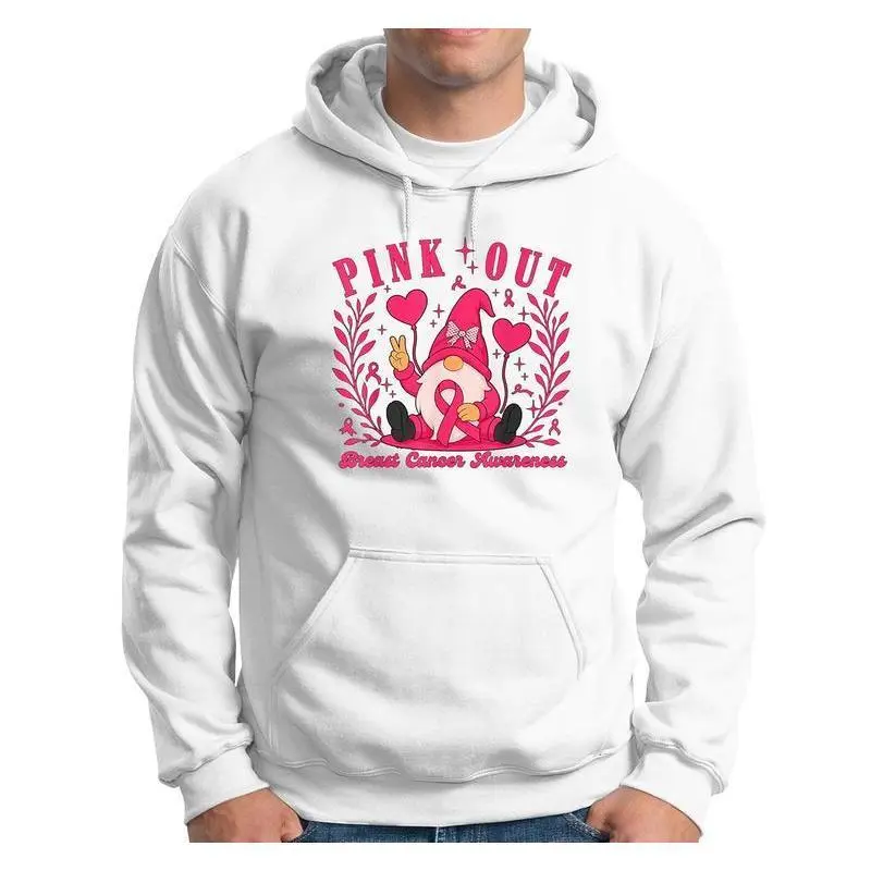 Elevate your casual wardrobe with this striking Pink Out graphic pullover hoodie, crafted from a high-quality cotton-polyester blend that combines softness with long-lasting durability. The bold pink-themed print on the front, featuring a gnome and heart elements with the "Pink Out" lettering, adds a vibrant and playful touch to your everyday look, making it a standout piece for casual outings, gatherings, or relaxed home wear. Designed with a classic pullover style and a cozy hood, this hoodie offers a comfortable relaxed fit that suits both men and women. With multiple sizes available, it caters to different body types, ensuring a flattering and snug wear for anyone who loves trendy, eye-catching casual wear.