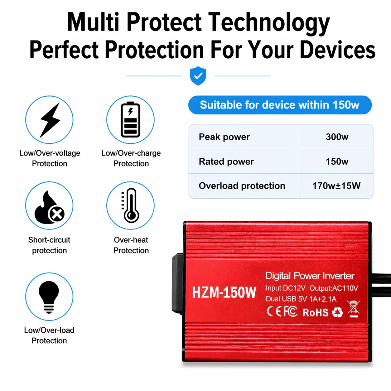 Built-in 20A replaceable fuse and a safe charging design protect your devices from under-voltage, over-voltage, short circuits, overloads, and overcharging. Note: For devices exceeding 150W, connect directly to the car battery to avoid blowing the fuse.