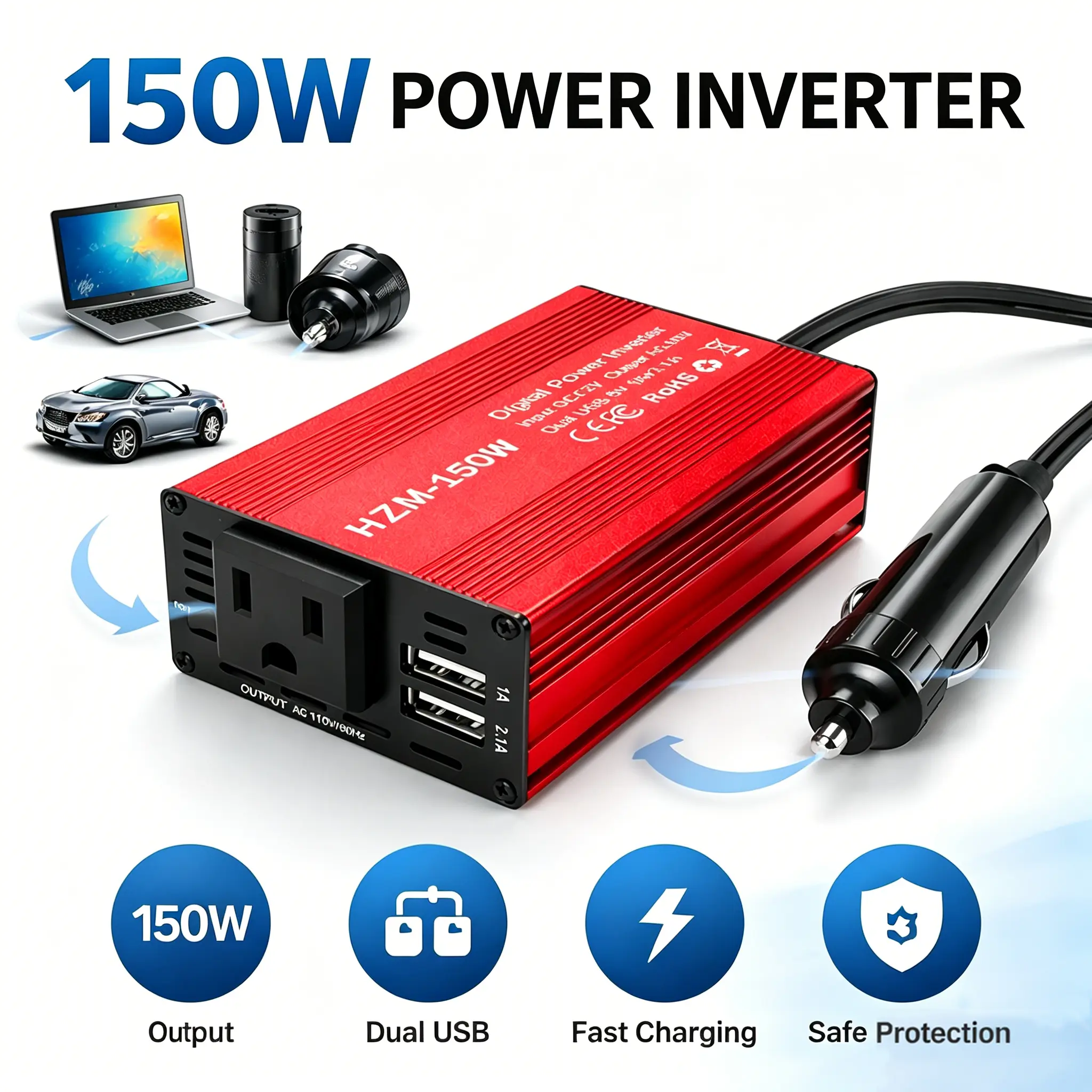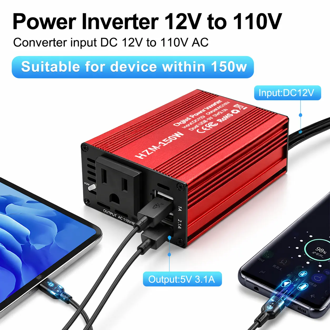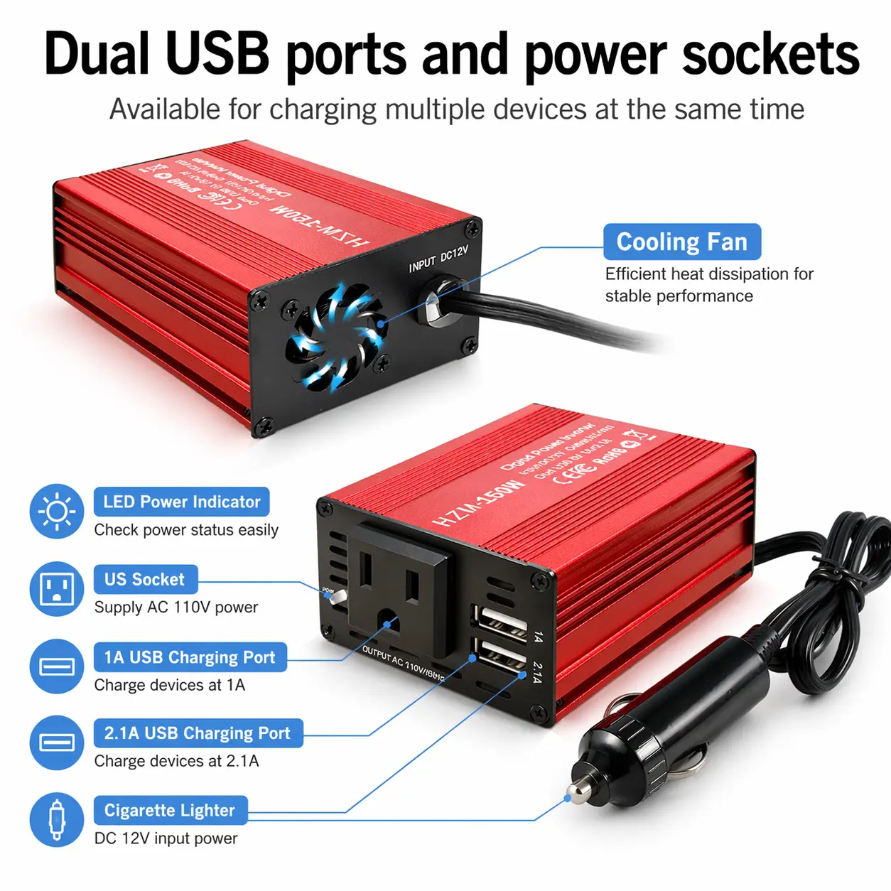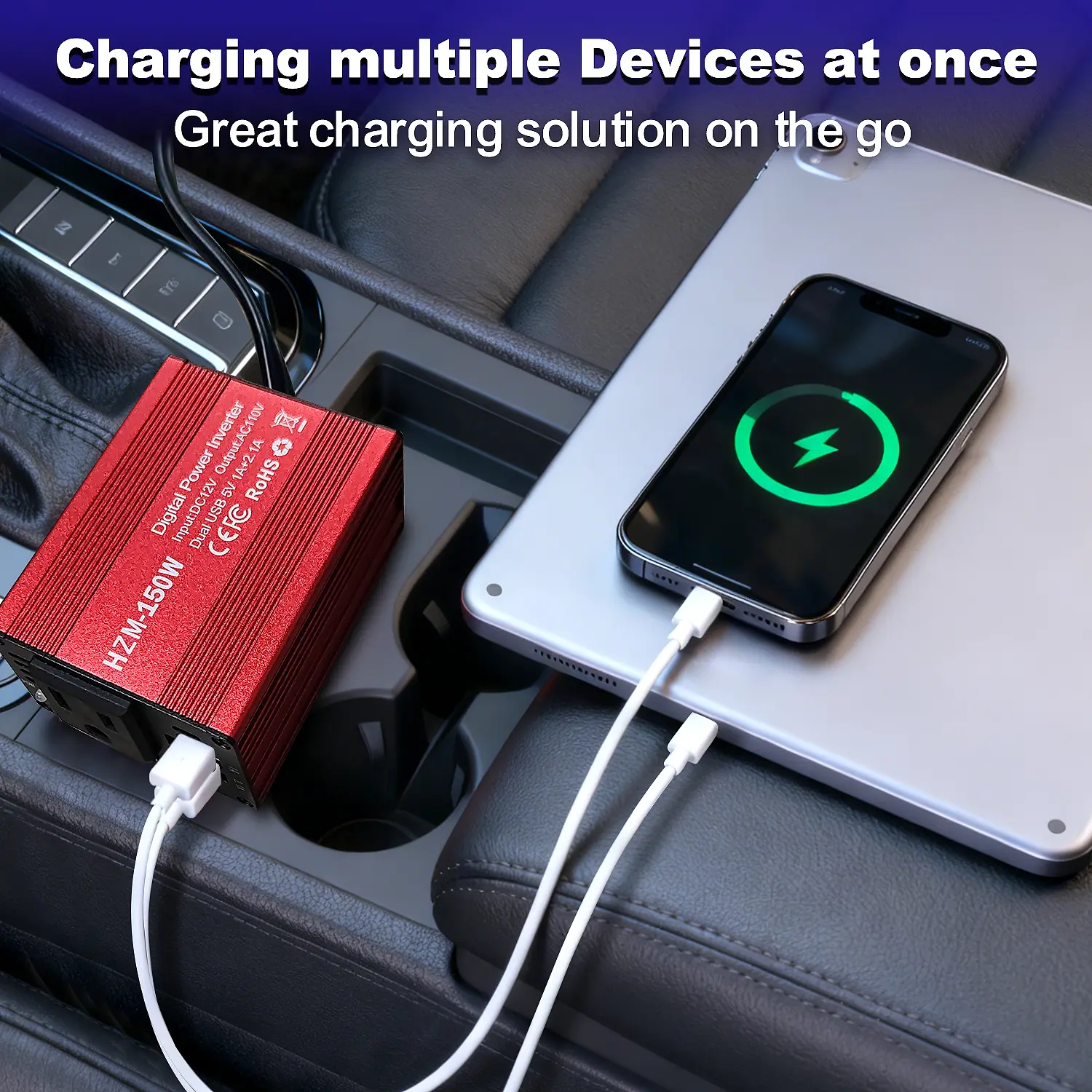 Unlike most car power inverters that only offer one USB port, this 150W inverter comes with two USB ports (2.1A & 1A), allowing you to charge phones and tablets simultaneously. The 110V AC outlet is perfect for charging laptops, game consoles, Kindles, TVs, DVD players, and more. Ideal for vacations, business trips, camping, or power outages.