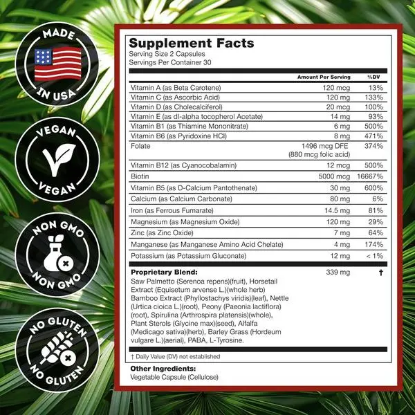 ·3 In 1: Make Your Nails & Skin Healthier Too - Carefully chosen ingredients mixed in amazing blend with Saw Palmetto, Spirulina, Biotin, Zinc, Mineral Complex and Vitamins will make your nails and skin healthier. Biotin also helps to keep your eyes, liver, and nervous system healthy. With just 1 product you can bring your overall health to the next level.