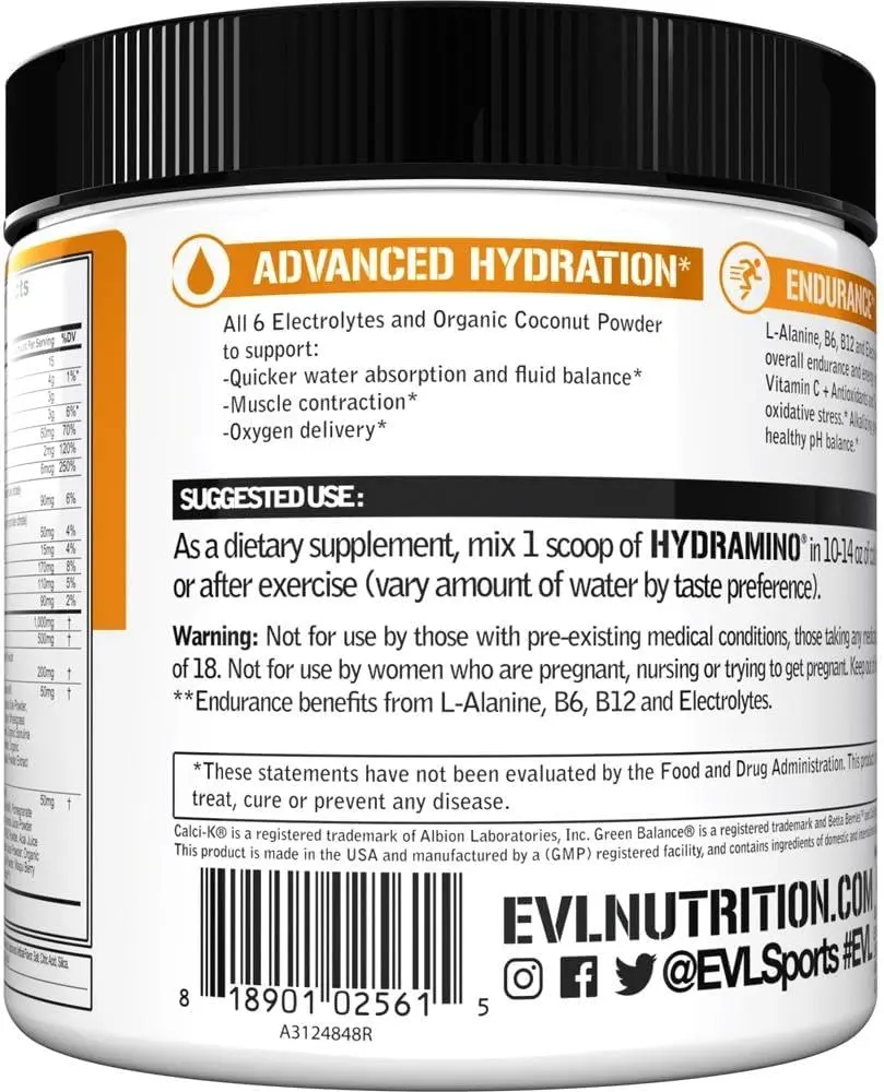 ·Use Anytime – Evlution Nutrition Hydramino is caffeine free for use any time, day or night, as a clean, stimulant free hydration support supplement. Our unique formula contains only 15 calories, is Vegan and also Gluten-Free.