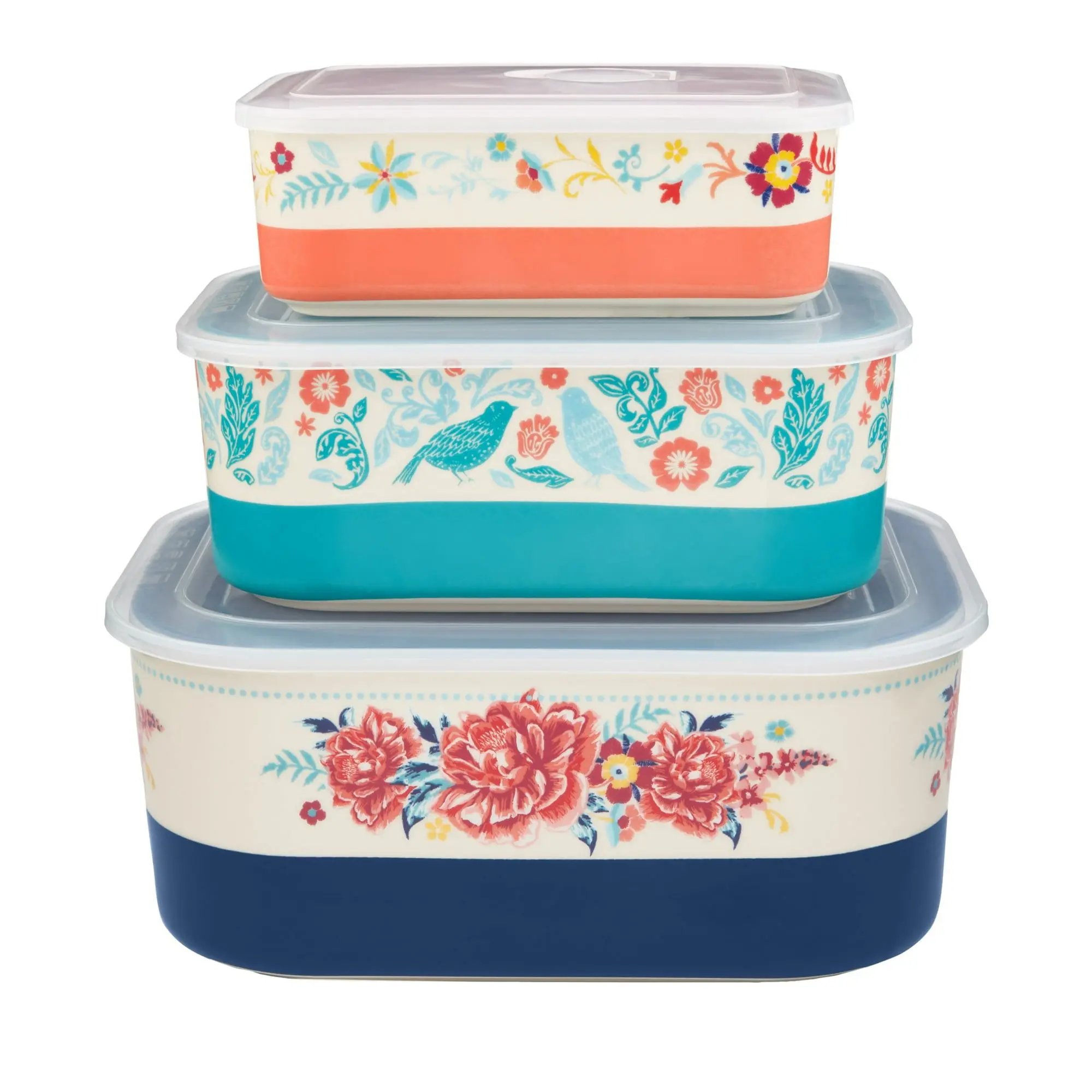 Bowls nest for compact and convenient storageFeature Ree's signature floral designsIncludes 3 bowls and 3 snap-shut lidsDishwasher safeMade of durable stonewareMix and match with other items fro