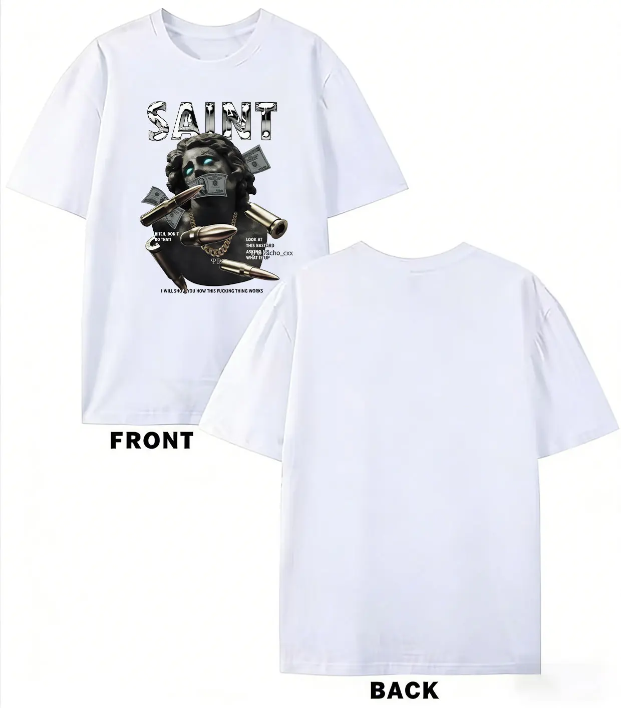 Rep the iconic "SAINT" aesthetic with this edgy, modern streetwear tee! Featuring a striking graphic of a classical statue with a modern, rebellious twist—gold chains, dollar bills, and bullets piercing through the statue—paired with the bold "SAINT" lettering at the top. This shirt blends classical art inspiration with contemporary hip hop and urban culture, creating a unique, eye-catching look that's perfect for standing out. Ideal for streetwear enthusiasts, hip hop fans, or anyone who loves bold, edgy fashion.