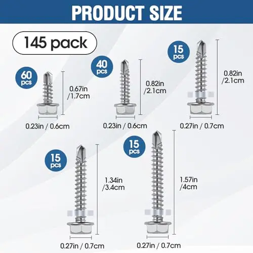 Multiple Sizes Included – #10 with Washers for ScrewsThis 145-piece assortment includes 5 commonly used sizes: #8 × 1/2" — 60 pcs #8 × 3/4" — 40 pcs #10 × 1" — 15 pcs (with washers for screws) #10 × 1-1/4" — 15 pcs (with washers for screws) #10 × 1-1/2" — 15 pcs (with washers for screws) Washers for screws on #10 sizes provide better sealing and grip when fastening to metal surfaces.
