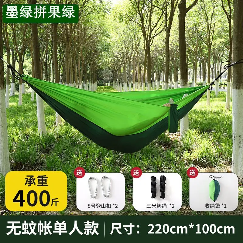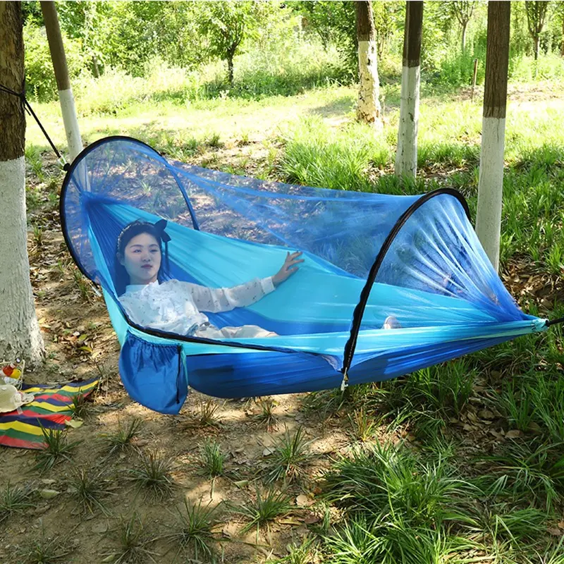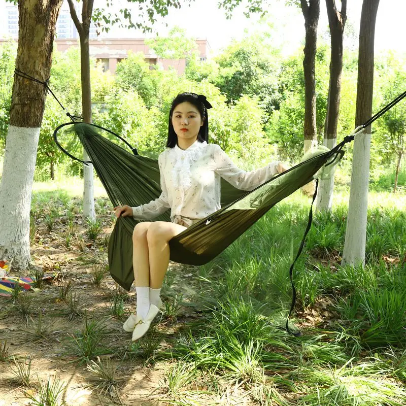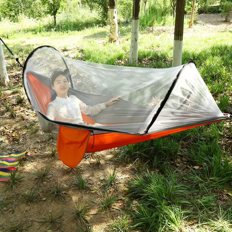 This all-in-one mosquito net hammock redefines outdoor comfort, combining a breathable parachute fabric hammock with an integrated fine mesh mosquito net to keep bugs at bay while you relax. Crafted from high-strength nylon material, it boasts excellent tear resistance and a robust load capacity of up to 300 lbs, supporting single or double occupancy for camping, hiking, backyard lounging, or beach trips.