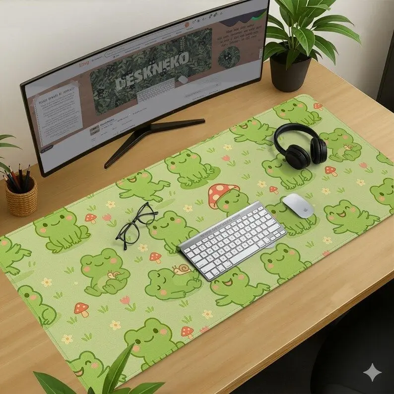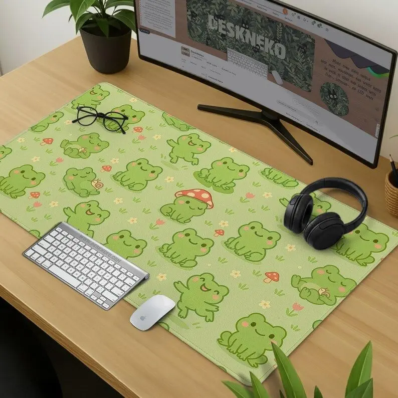 [SALE UP TO 50% + FREE SHIP] Cute Kawaii Frog Desk Mat, XXL Aesthetic Mousepad Gaming, Large Non Slip Extended Deskmat, Pastel Green keyboard Mouse Pad, Gift for Student