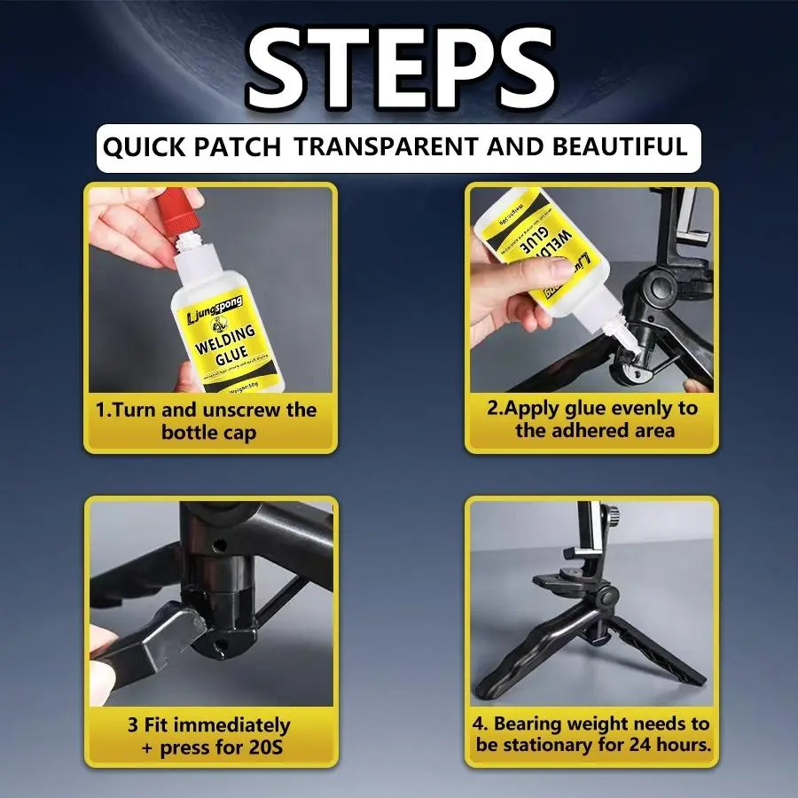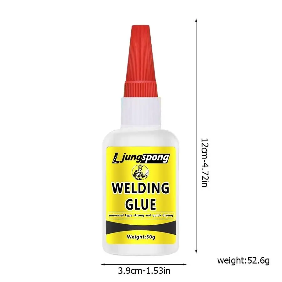Multi-Material Strong Bond:Welding-grade adhesive sticks firmly to metal, plastic, wood, ceramics, ideal for various repairs..Transparent & Quick-Drying:Clear formula sets in 10-40s, cures fully in 24h, weather-resistant and wear-proof..Dual Welding Flux Effect:Contains soldering flux to strengthen joints, no extra flux needed, simplifies operation..Oil-Based Penetration:Oil formula penetrates material pores, works well on oily surfaces, ensures long-lasting bond..50ml Precise Dispensing:Single-tube squeeze bottle with fine tip for controlled application, minimal waste for DIY and repairs.