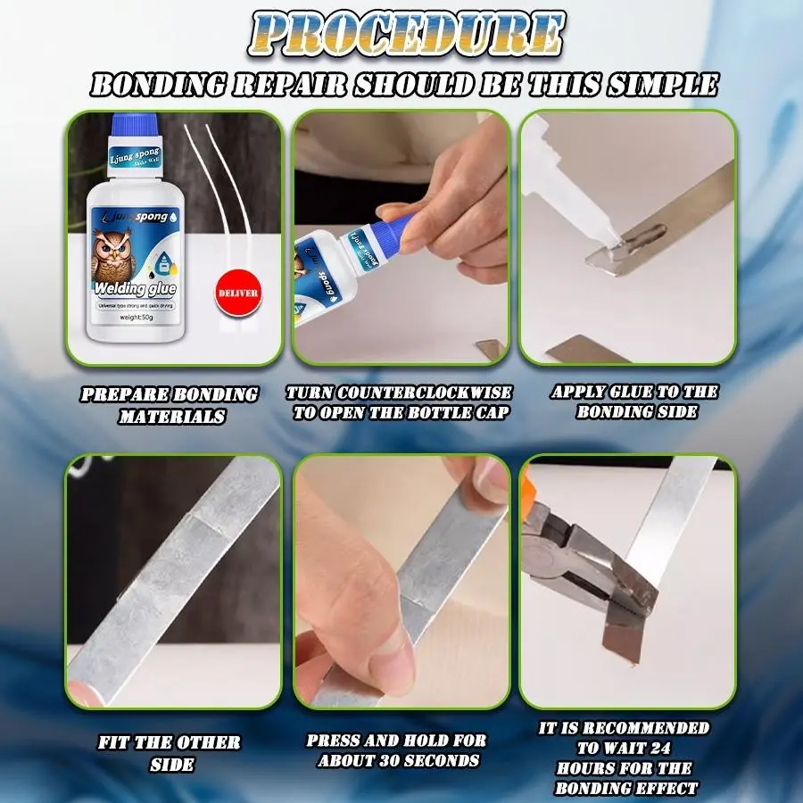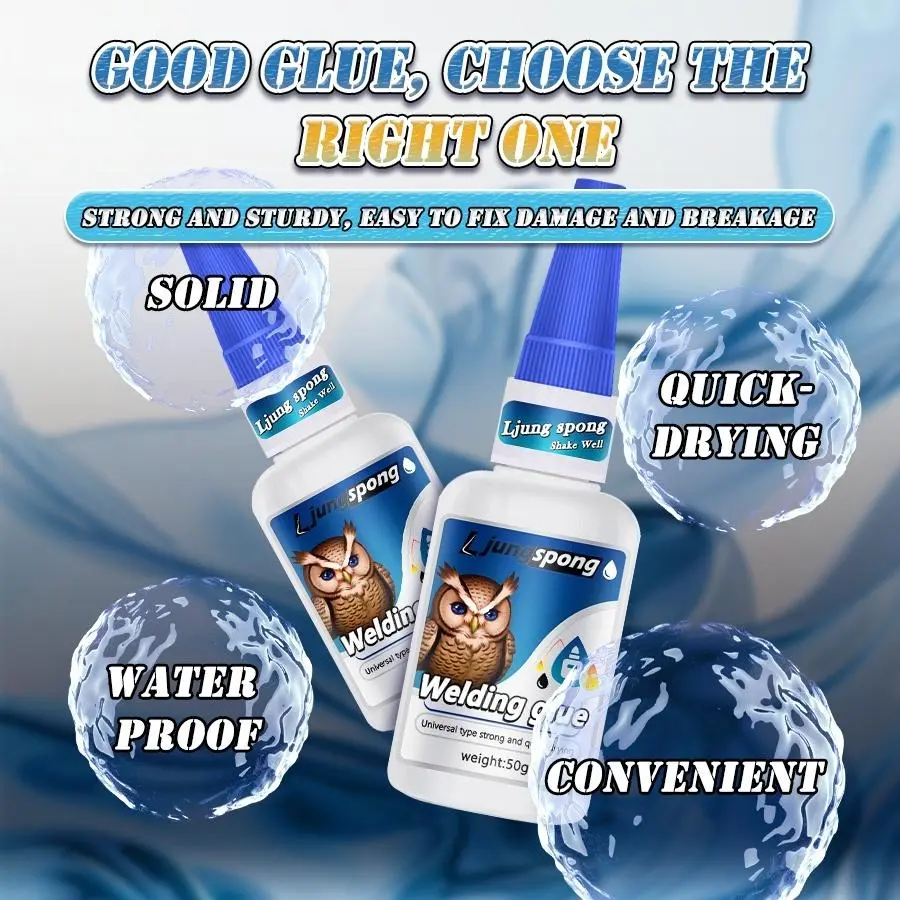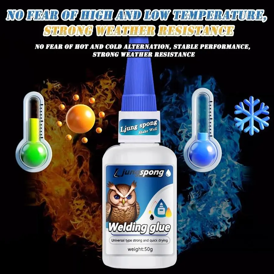 Multi-Material Strong Bond:Welding-grade adhesive sticks firmly to metal, plastic, wood, ceramics, ideal for various repairs..Transparent & Quick-Drying:Clear formula sets in 10-40s, cures fully in 24h, weather-resistant and wear-proof..Dual Welding Flux Effect:Contains soldering flux to strengthen joints, no extra flux needed, simplifies operation..Oil-Based Penetration:Oil formula penetrates material pores, works well on oily surfaces, ensures long-lasting bond..50ml Precise Dispensing:Single-tube squeeze bottle with fine tip for controlled application, minimal waste for DIY and repairs.