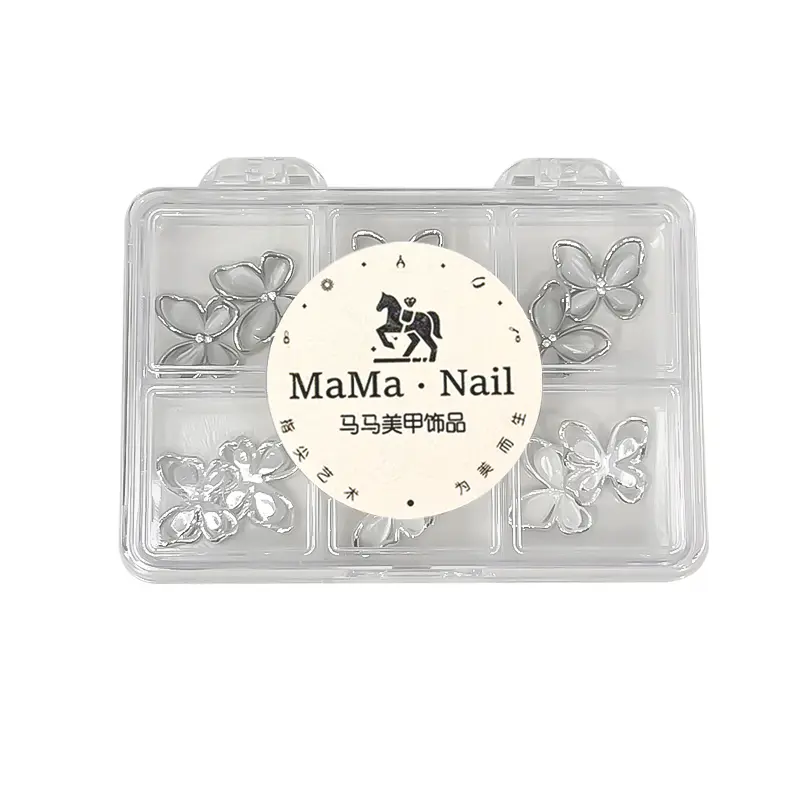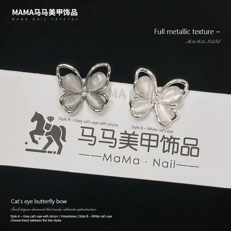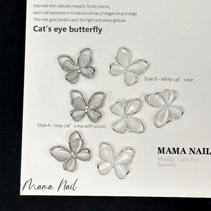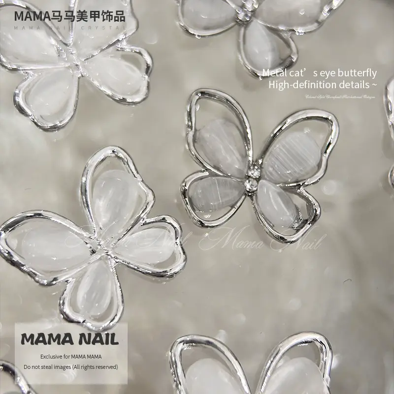 Metal Cat's Eye Butterfly & Flower Nail Charms, 3D Hollow Silver Nail Art Gems, Elegant DIY Manicure Decorations for Nail Art