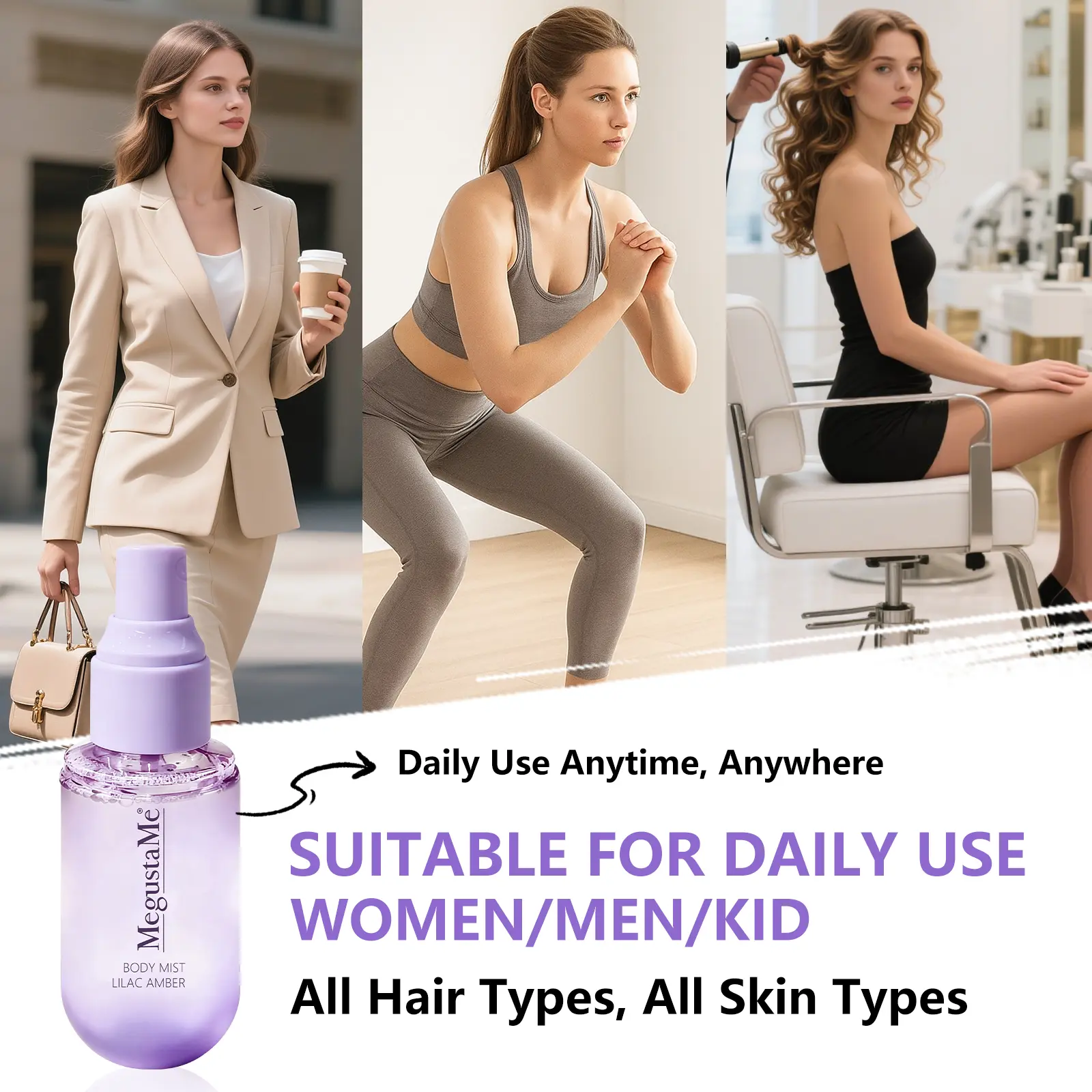 ·The signature MegustaMe scent is a lavish blend of lavender amber and floral woody notes, highlighting the iconic signature fragrance. Our Lilac Amber Body Perfume combines the fresh blooming scent of lilacs with the warm, sweet undertone of amber. This elegant and luxurious scent creates an irresistible charming atmosphere for women's daily styling.