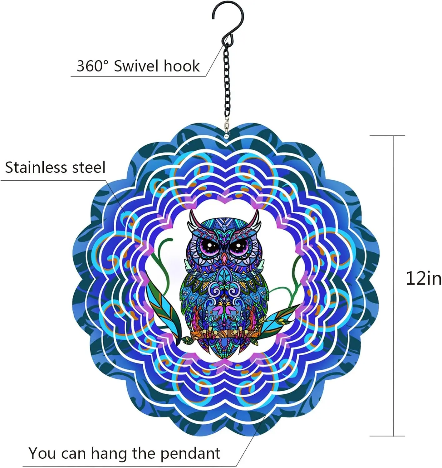 ·【3D Kinetic Wind Spinner Decor】The magical owl style inspires the decorative hanging wind spinner, which adopts PUV Print Technology with a frosted paint finish, giving off a sparkling when it a spin. The unique design combined meaningful animal pattern and a 3D streamer effect to make it seems more visual. Suitable decorate your garden and patio.