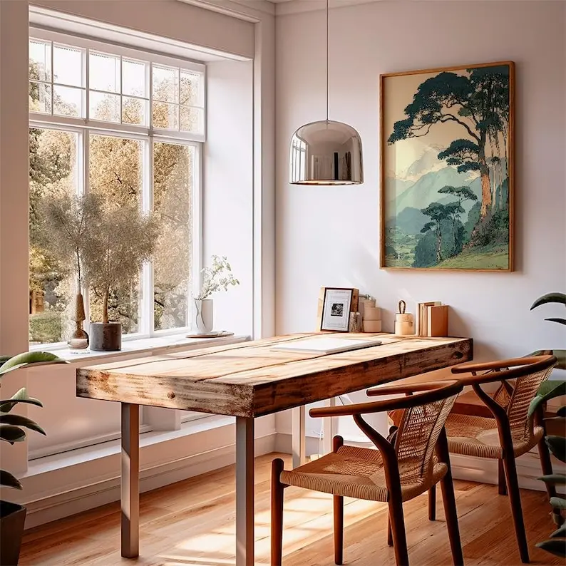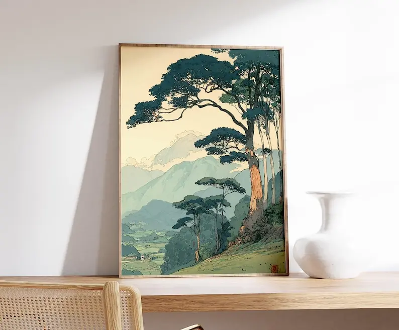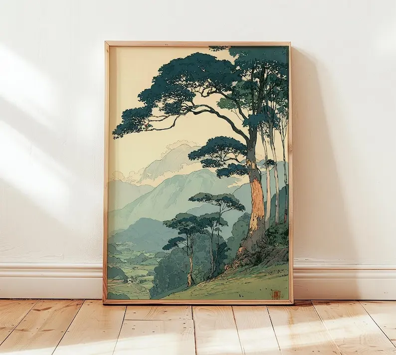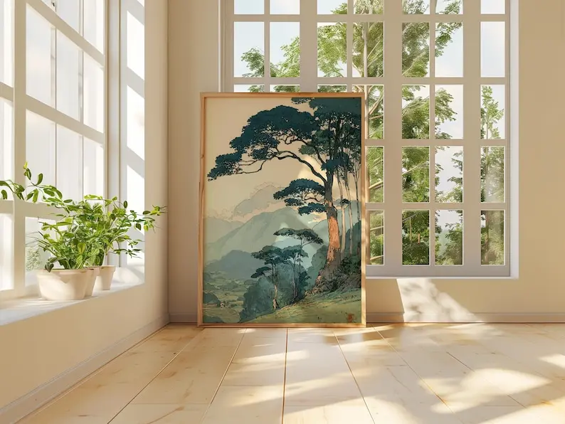 Vintage Japanese Forest Unframe Poster, Tranquil Mountain Landscape Wall Art, Retro Nature Print, Minimalist Tree Scene, Serene Home Decor