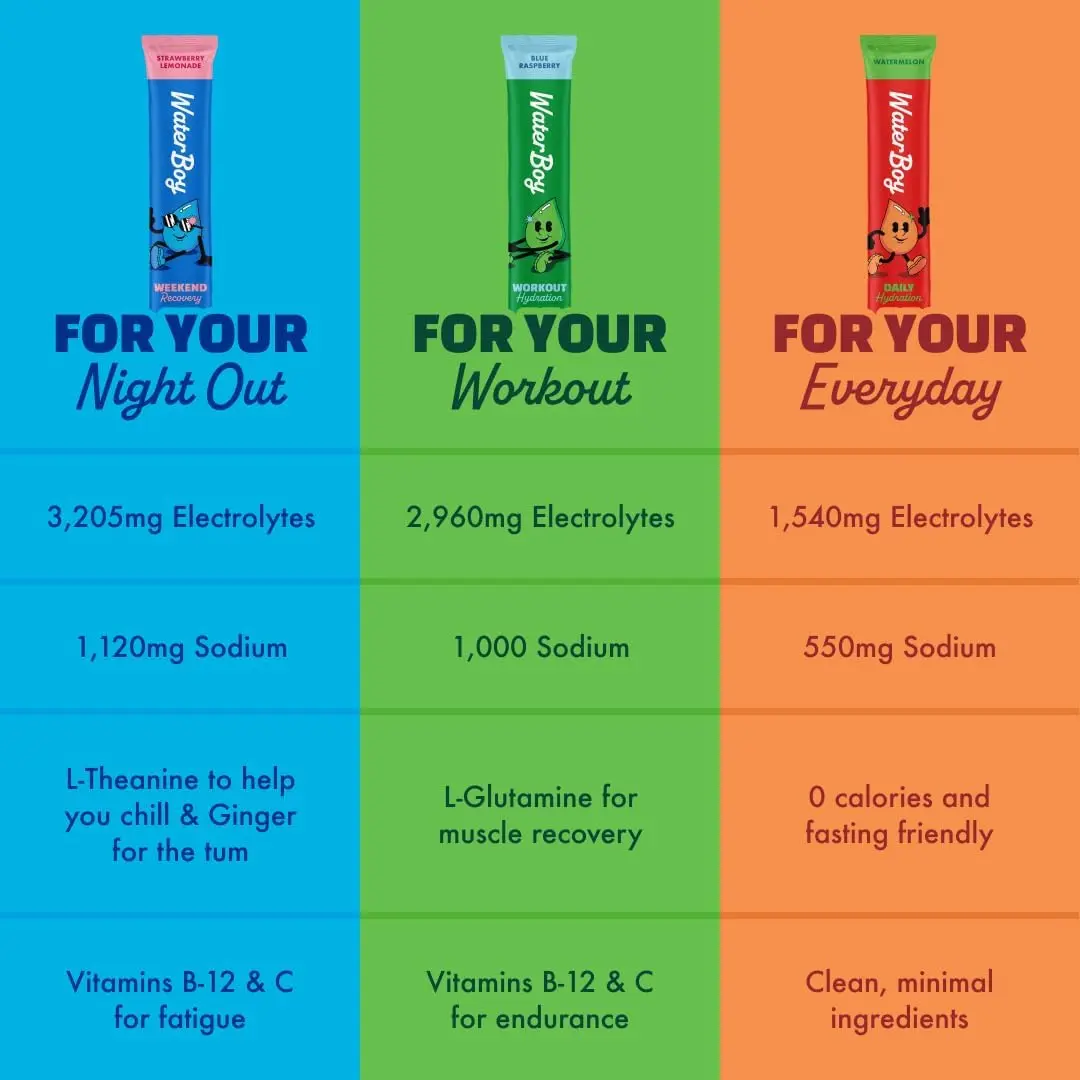 ·DELICIOUS FLAVORS (SALTY): Waterboy hydration packets come in multiple flavors including Strawberry Lemonade and Lemon Lime. If you like sweet products, you won't like this. Our taste is more subtle and refreshing.