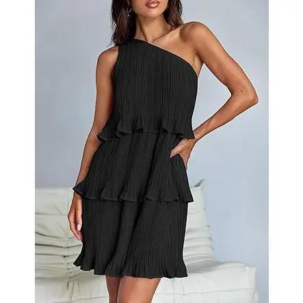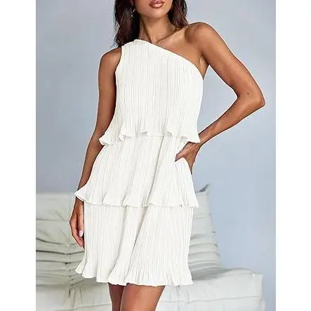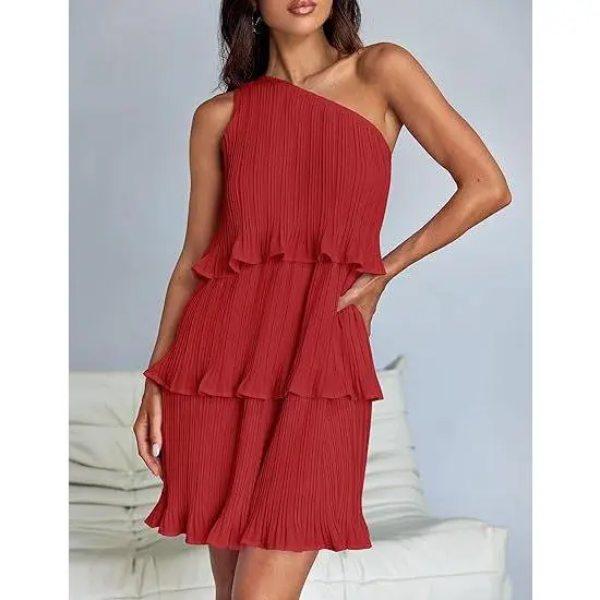 Women's Summer Sleeveless Mini Dress Boho One Shoulder Ruffle Tiered Layered Chiffon Flowy A Line Dresses