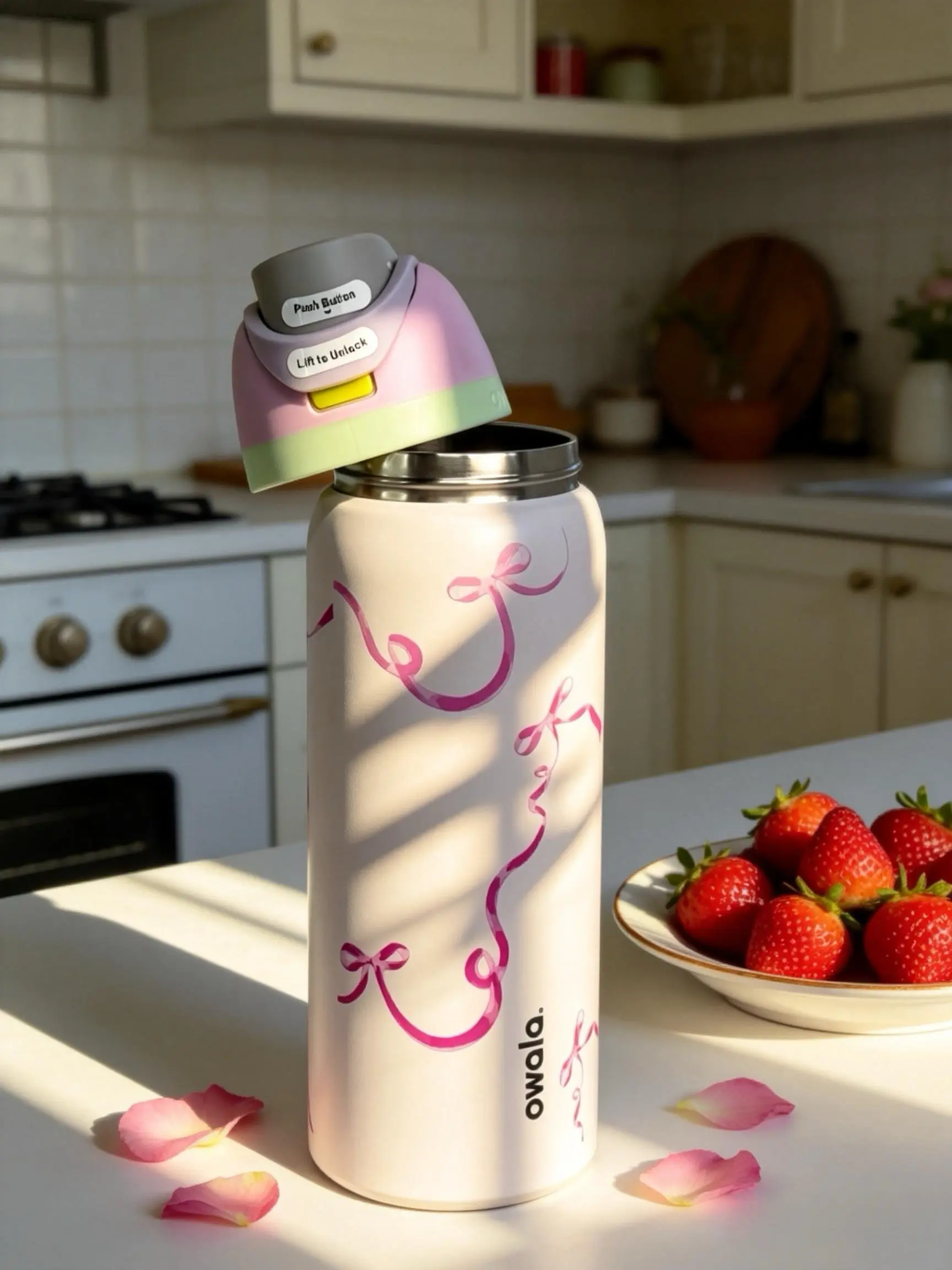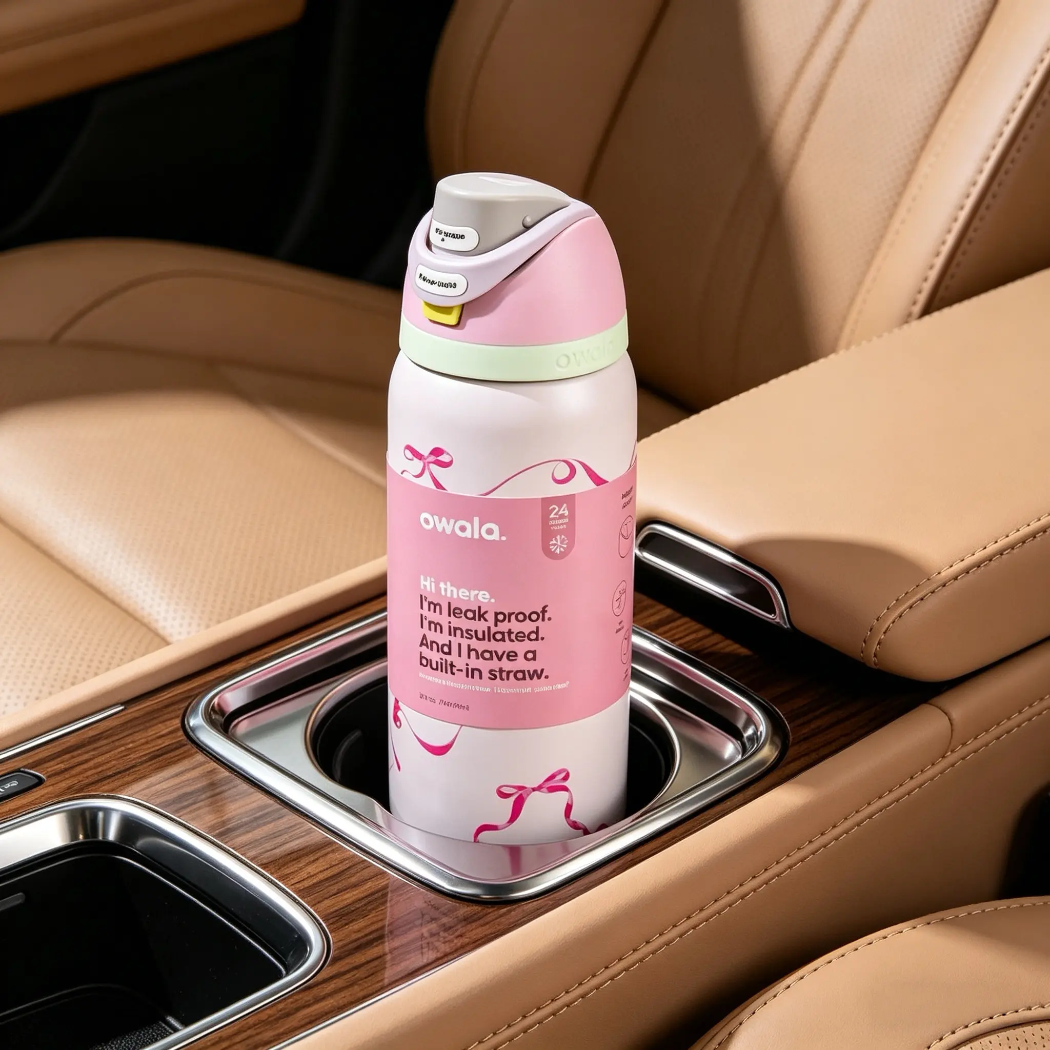 The Owala 32oz Pink Ribbon Stainless Steel Thermos Cup is your perfect companion for any occasion. It features a dual drinking holes design, allowing you to choose between sipping through the tube or direct drinking. One-click to pop open the lid and reveal the hidden handle. Ideal for commuting, office use, and outdoor activities. Stay hydrated in style!