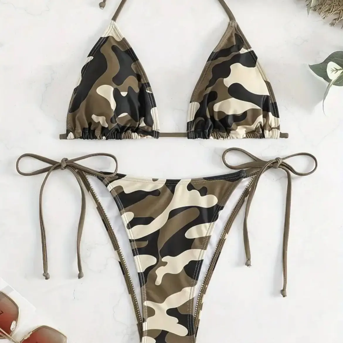 ·【Stylish Design】: This bikini set features a halter neck and backless triangle swim bra, paired with a tie-side swim thong, creating a trendy and chic look for the beach or vacation.