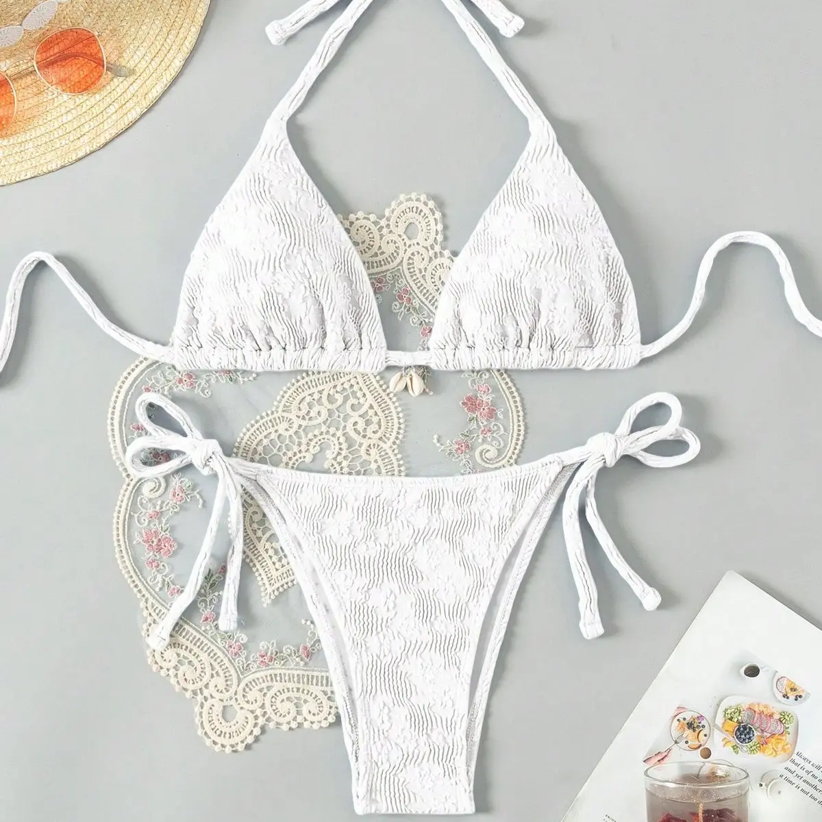 5. Elegant White Lace Textured Bikini Set - Smocked Floral 2-Piece Bathing Suit - Coquette Aesthetic Triangle Swimsuit - Minimalist Summer Beachwear
