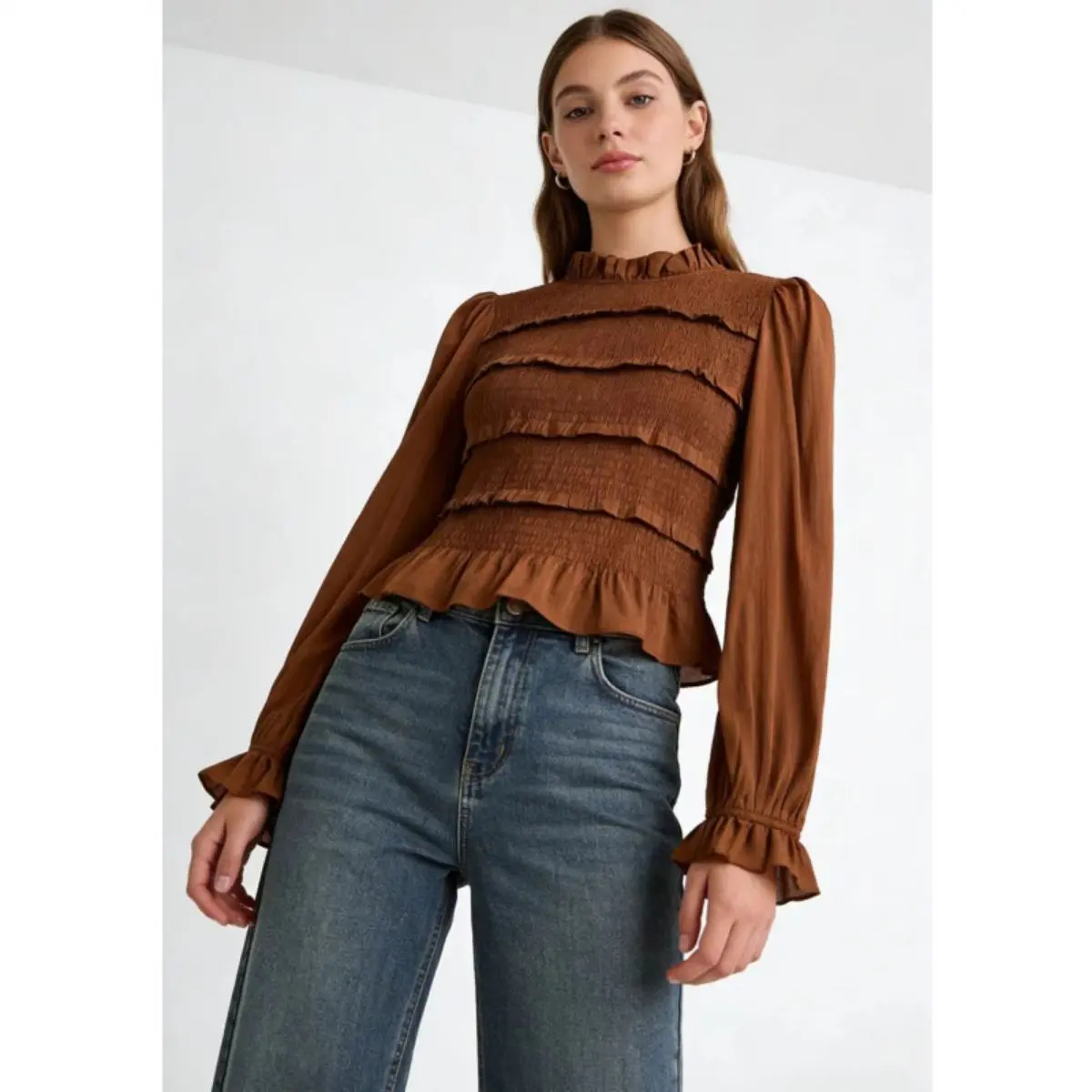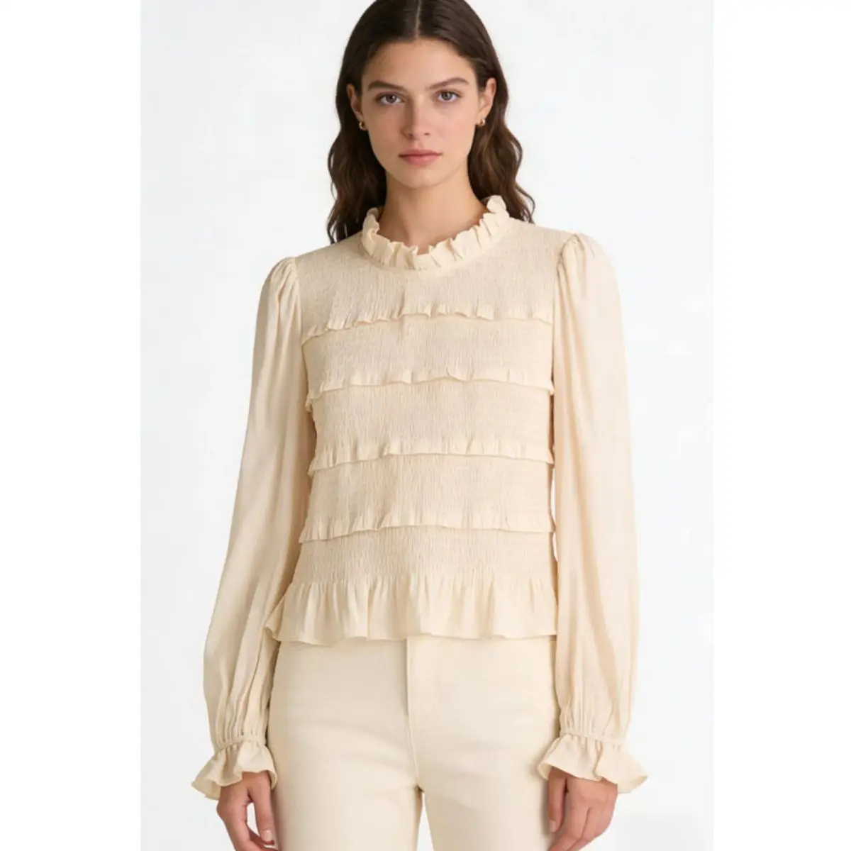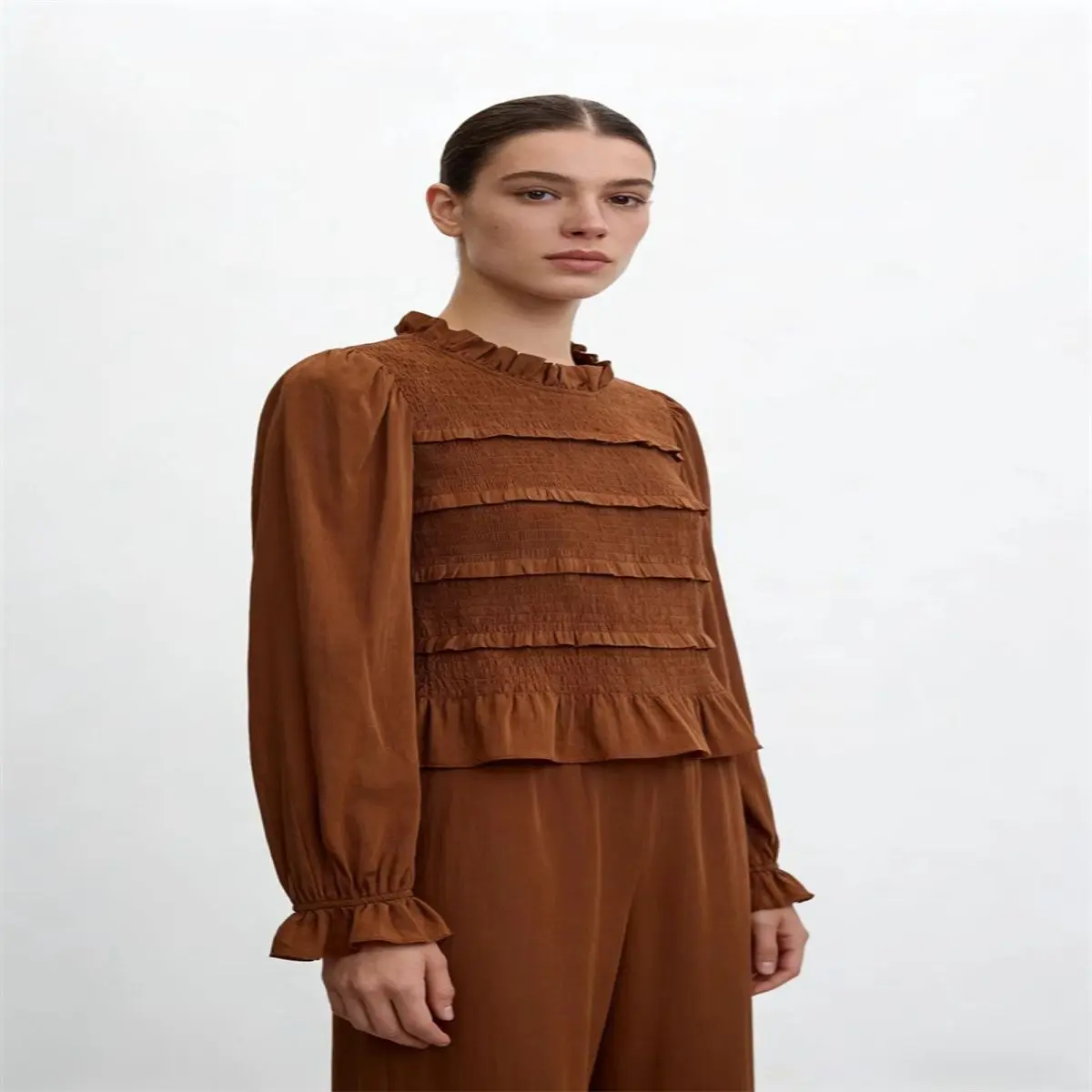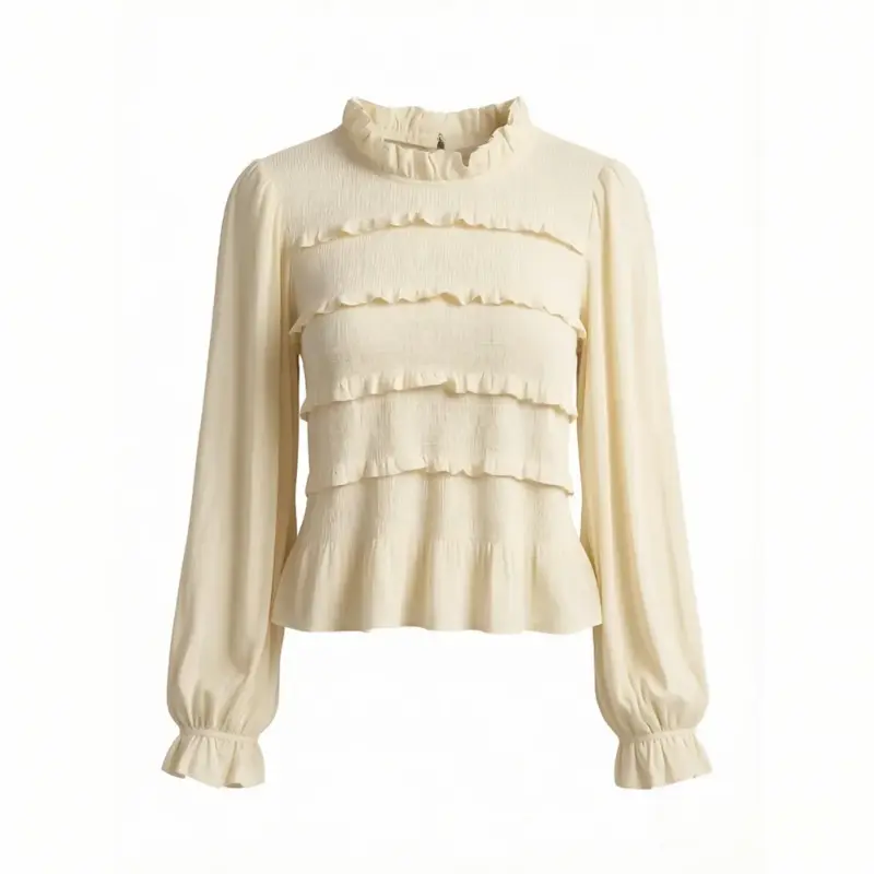 2026 new women's fashion commuting style top, slim fit version with ruffle collar, long sleeves and pleated details, stylish and practical for daily commuting and office wear.