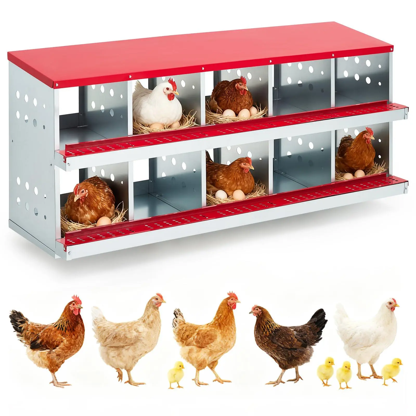 10 Compartment Chicken Nesting Box,Heavy Duty Galvanized Steel Rustproof Laying Box for Hens Ducks,Anti-Peck Rustproof Nest Boxes with Cover 37.8" l x 18.9" w x 27.95" h Red