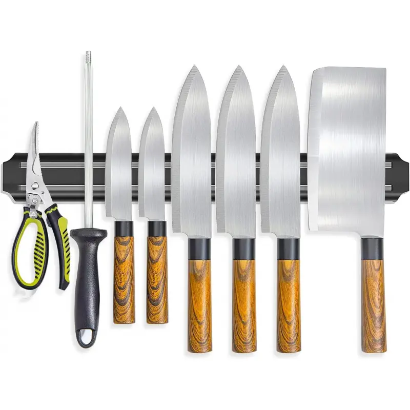 the powerful magetic strip can hold securely your knifes, We only use the strongest neodymium magnets And prevent young children won't have access to your sharp knives