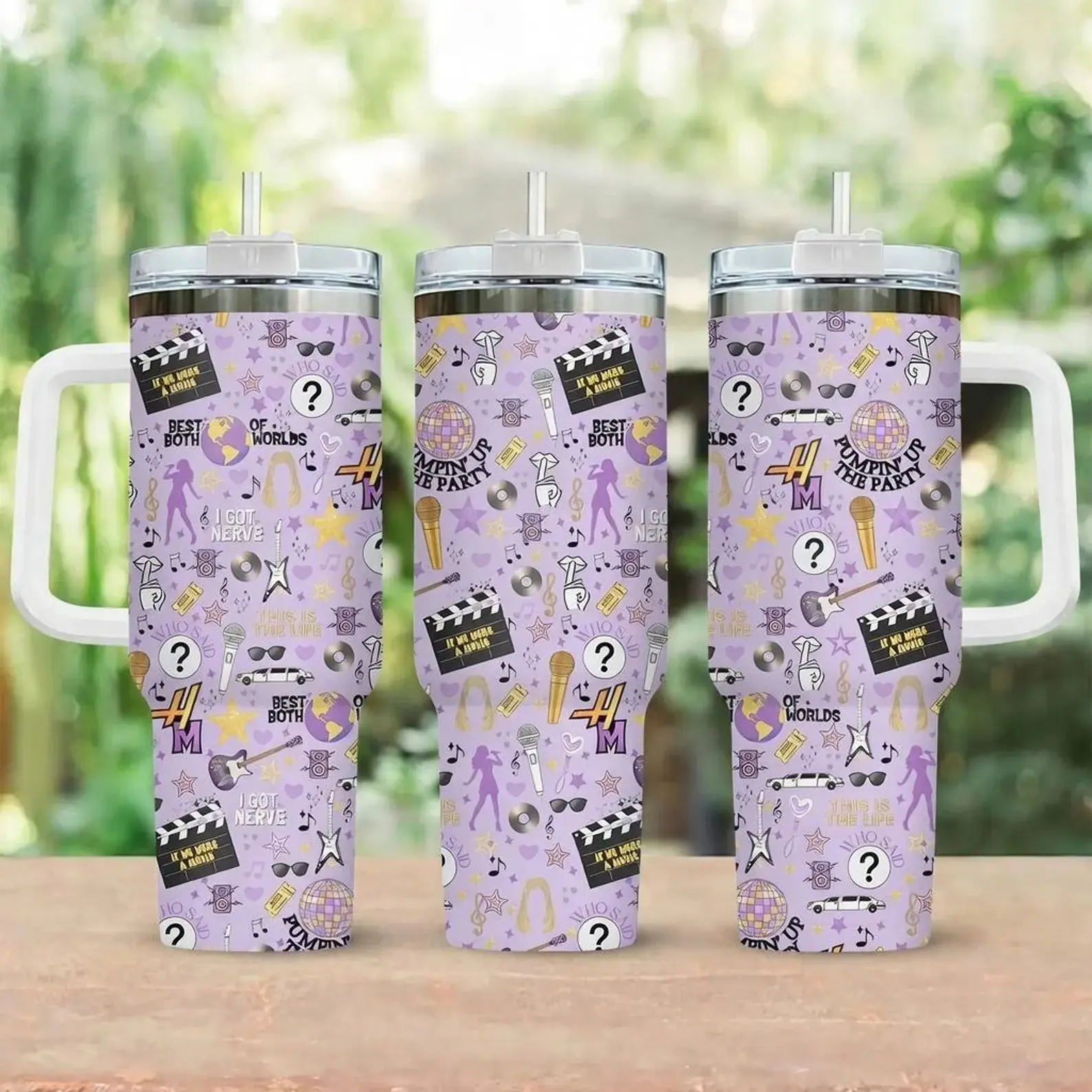 Hannah Montana 20th Anniversary Tumbler 40oz with Handle, Tumblers Purple Pop Star Drinkware Vacuum, Bottles Water Stainless Steel Tumblers, Gift For Fans