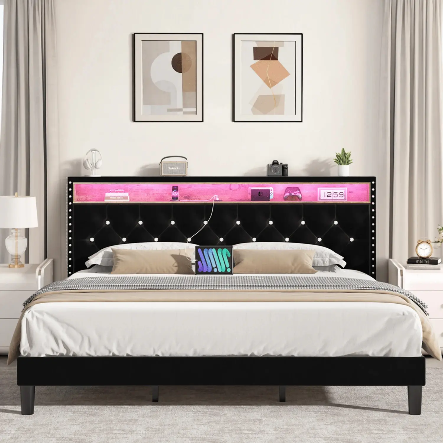 [Space-Saving Storage Options] The LED bed frame has 2 spacious tiers.This design provides ample storage space for everyday items on the bed frame, so you don't have to get out of bed to use them.