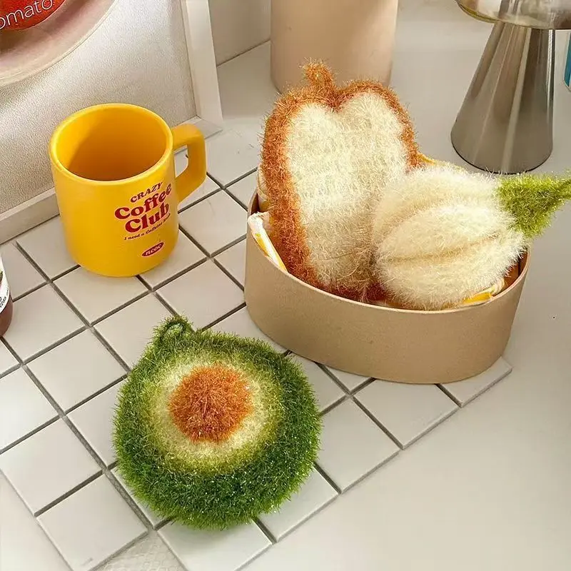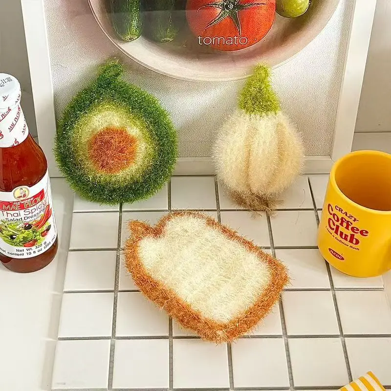 [3-Pack] Korean-style simulated avocado dishcloth, simulated toast bread dishcloth, simulated garlic head non-greasy cleaning cloth, easy to clean and lint-free household items