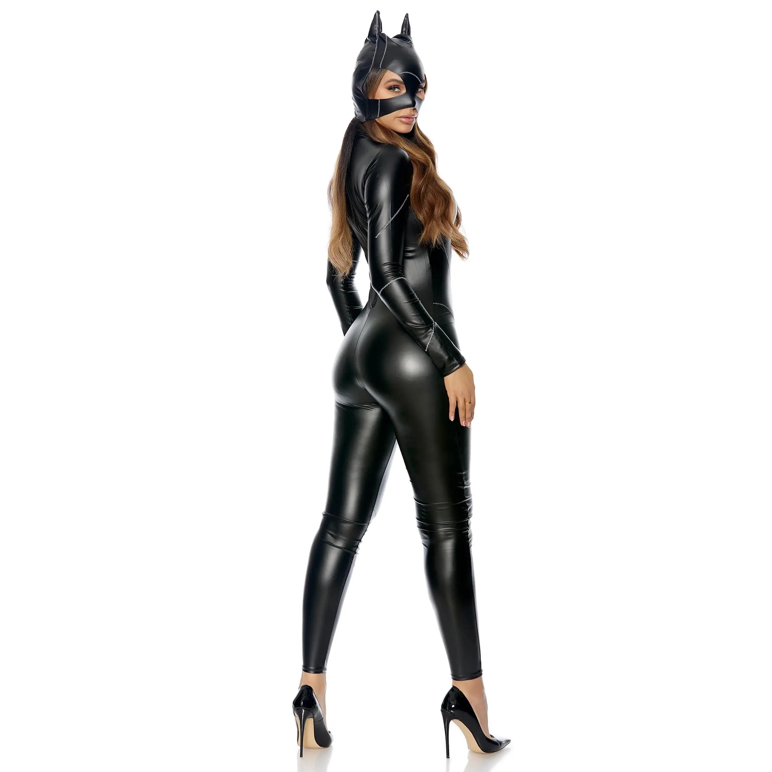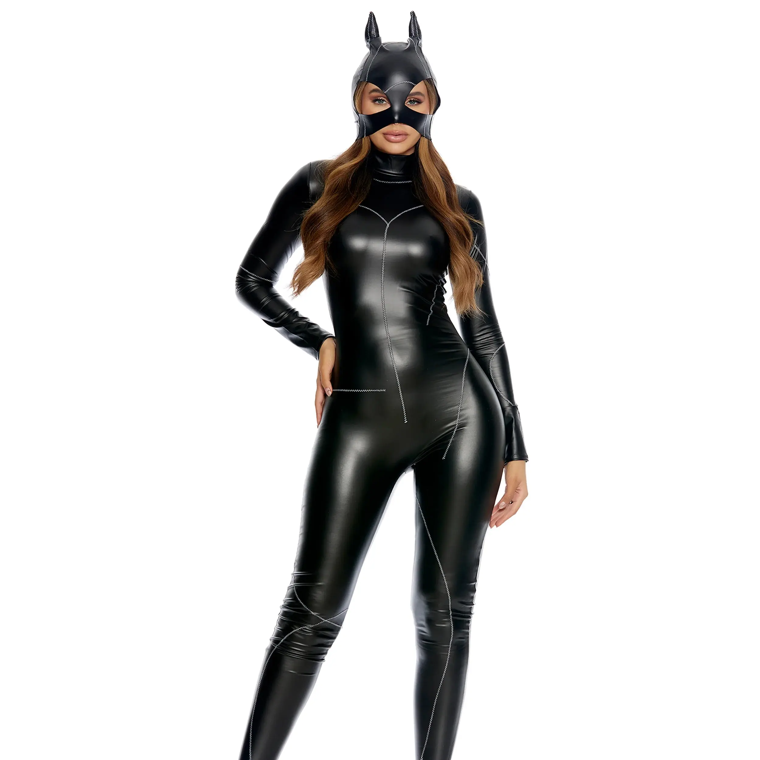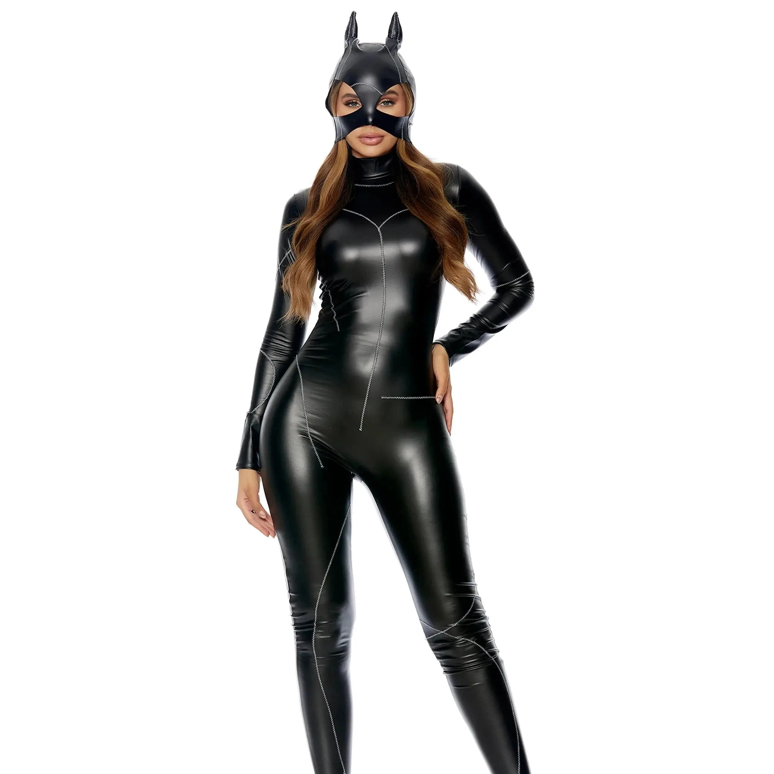 Claws will come out this Halloween when you suit up in our On The Prowl two-piece sexy cat costume. Whether you want to be a bad kitty or be the superhero you've always dreamed of, this faux leather jumpsuit with matching mask that features faux stitching detail is sure to make you the cat's meow!