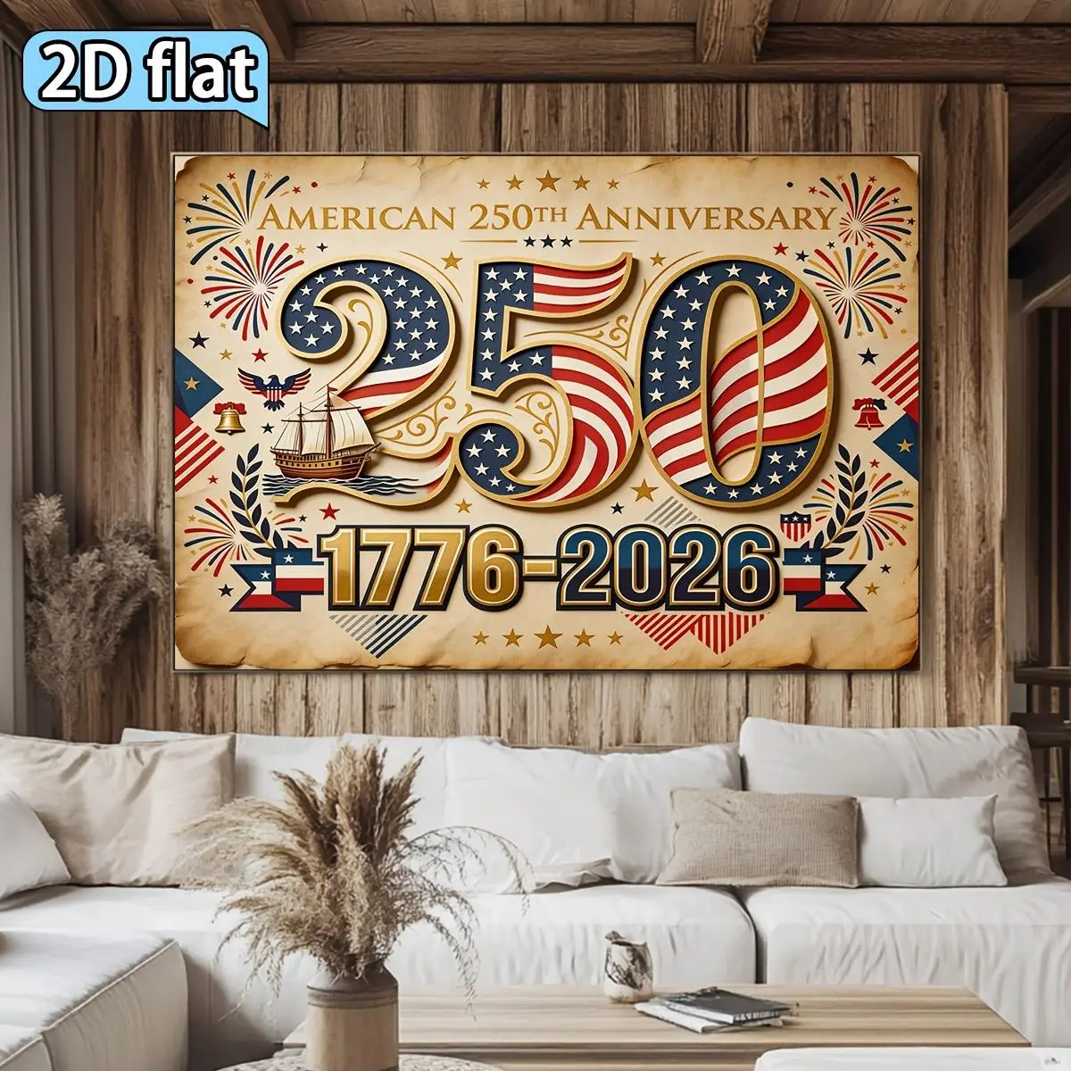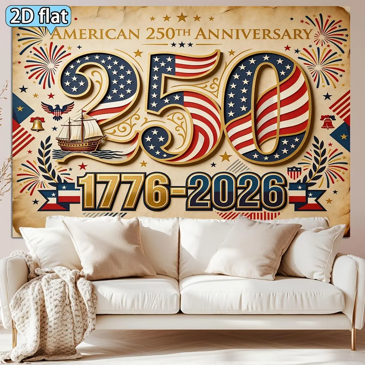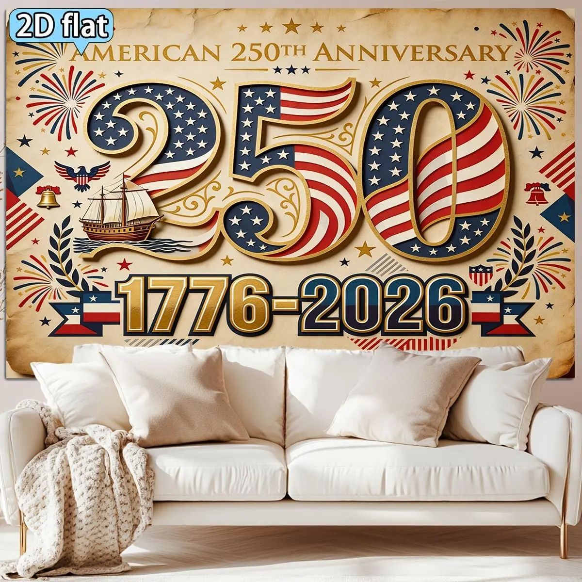 2D Flat, 2D Flat 1pc USA 250th Anniversary Theme Backdrop Red Blue White Golden Star and Stripes Elements Celebration Decoration 250th Anniversary Party Backdrop Tapestry, 2D Flat