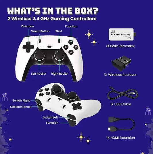 · Built-in Retro Game Sticks - Enjoy a collection of games with no need to download or install , as long as connected to the TV, monitor, or projector can play directly.
