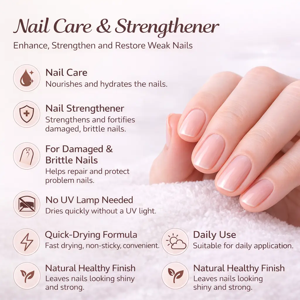 ·No UV Lamp Required: Convenience at its best. This nail care solution doesn't require a UV lamp, making it easy to use anywhere.
