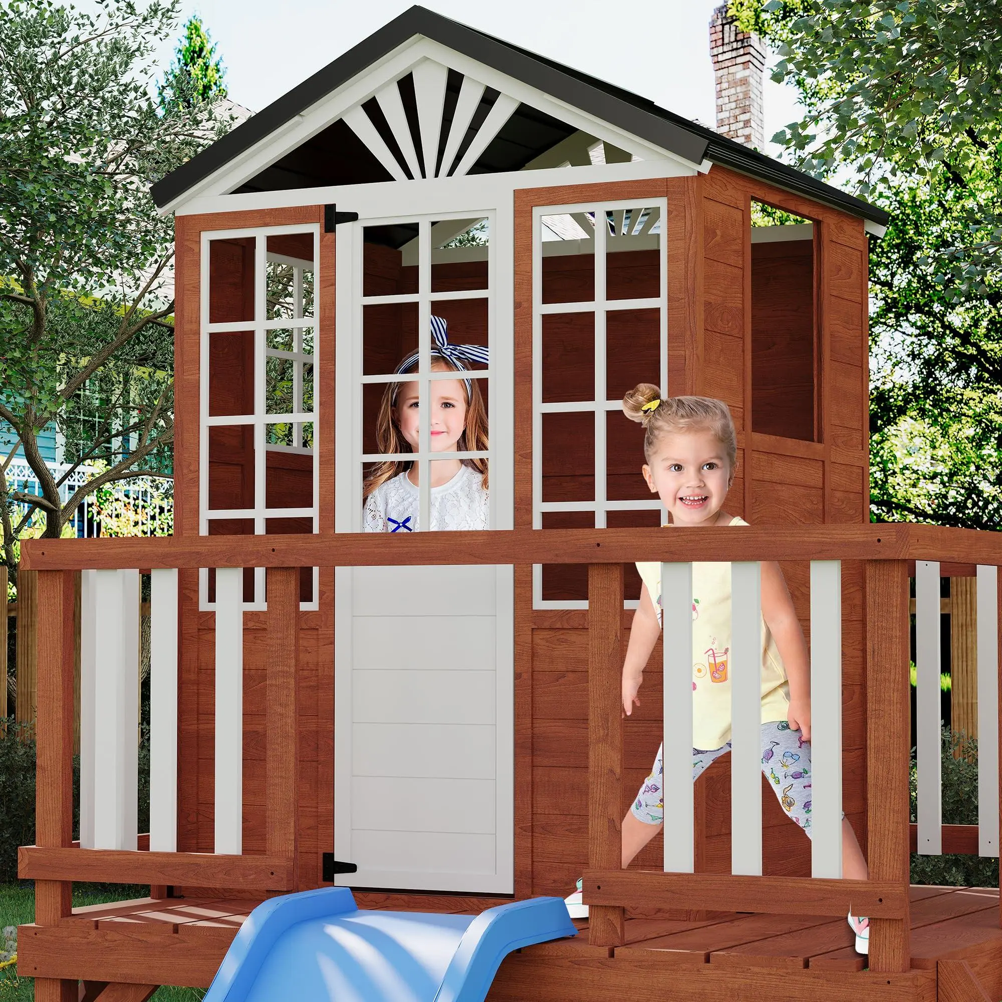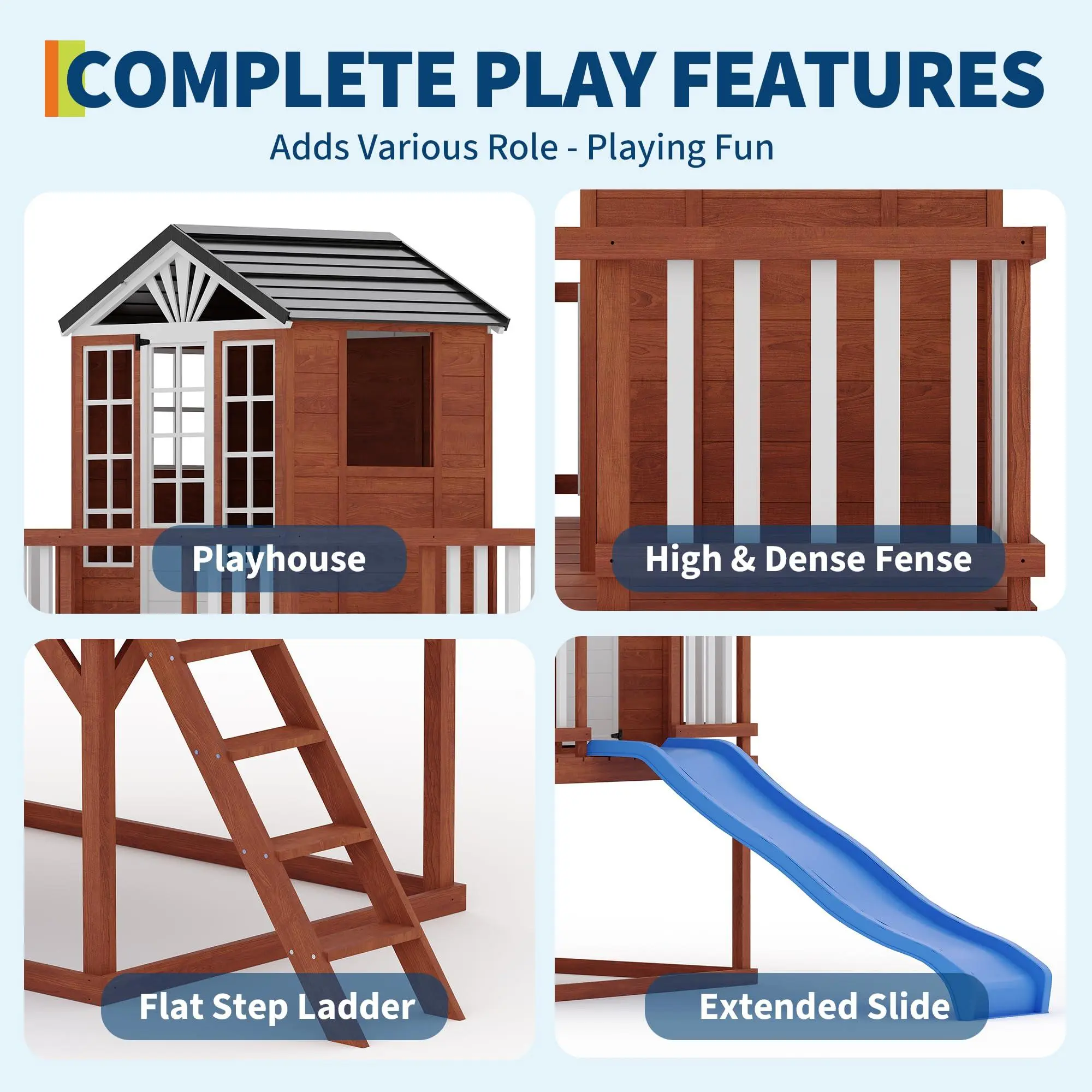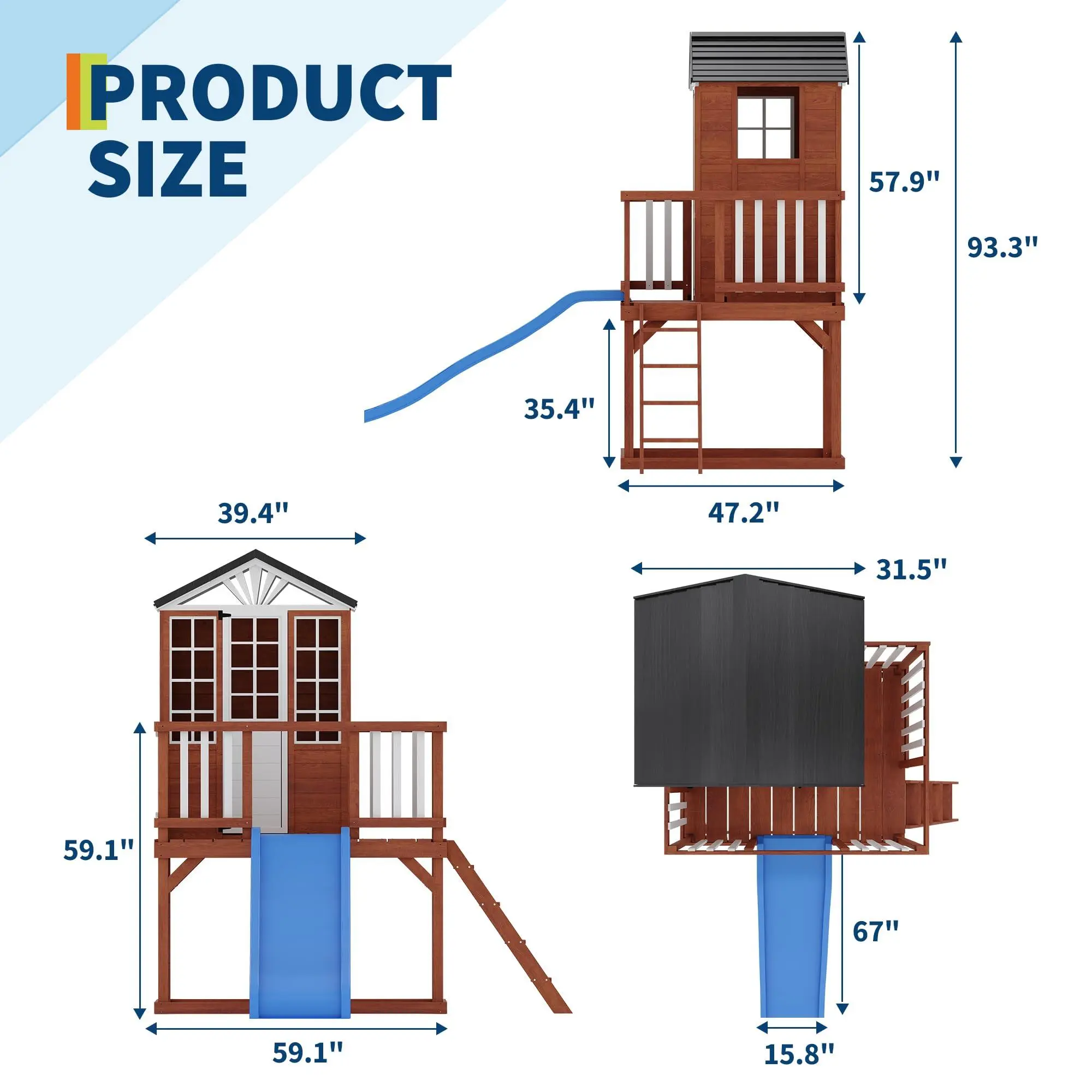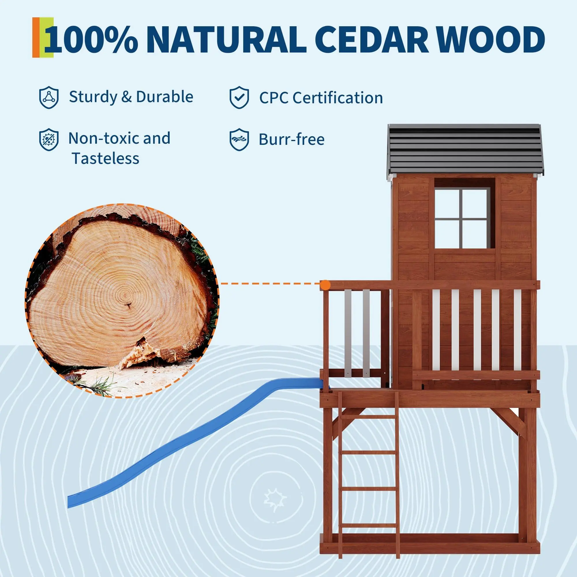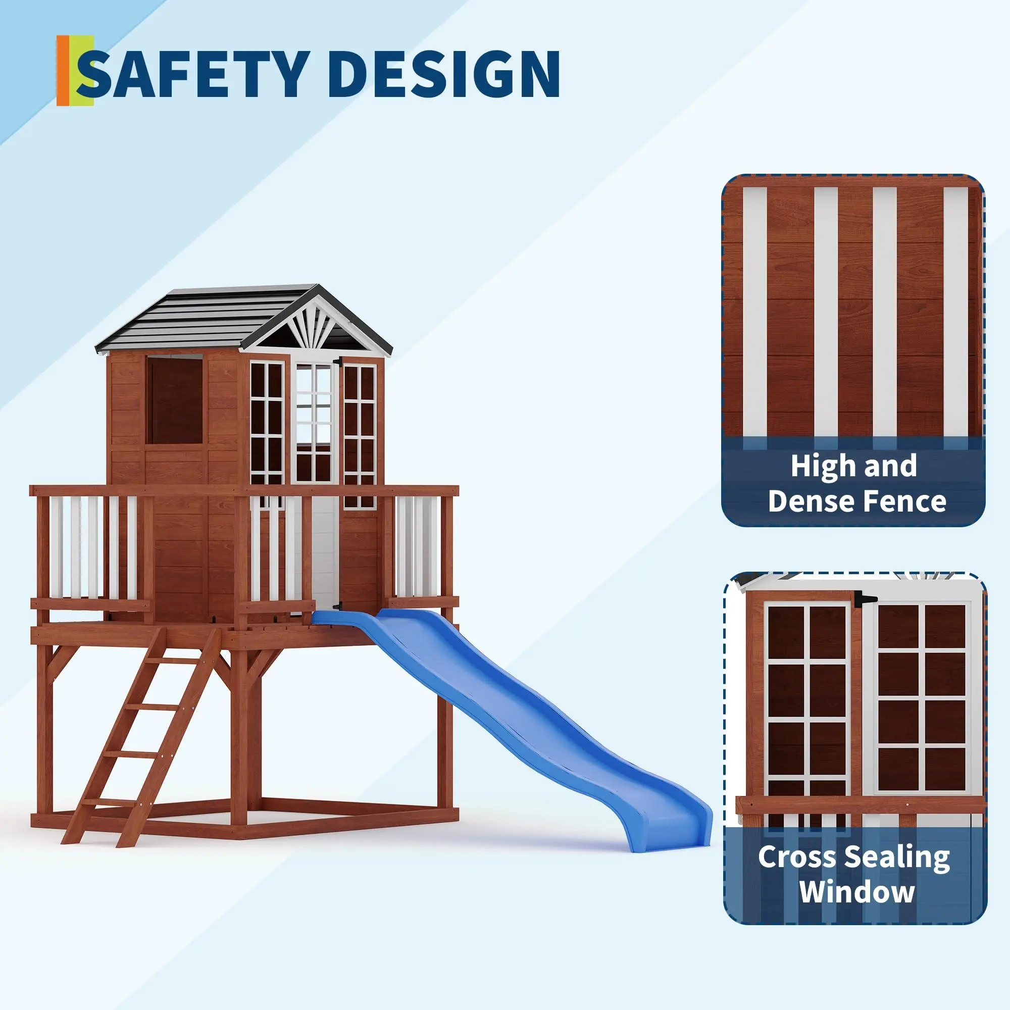 DURABLE & SAFE DESIGN - This kids clubhouse with slide is crafted from natural cedar wood, which is sturdy, durable, corrosion resistant, and sun-resistant. The wood surface is treated with outdoor water-based paint, making it suitable for use in harsh weather conditions. Its sturdy, thickened frame ensures excellent stability, providing a safe and secure play space for children aged 3-12