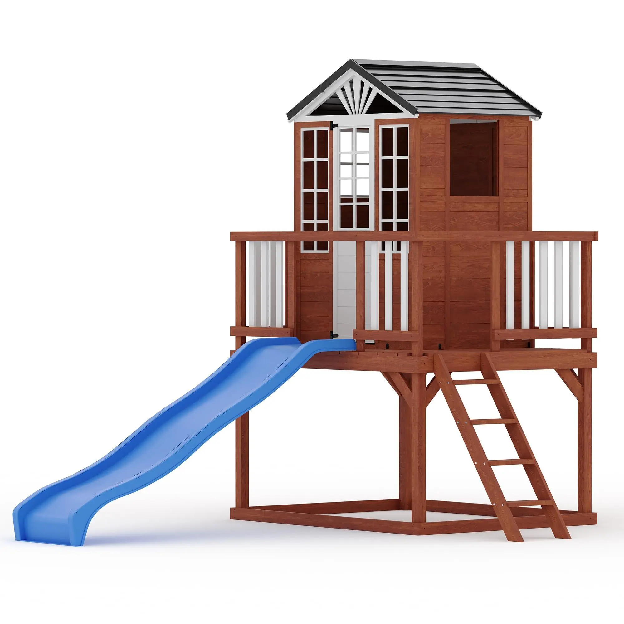 Kids Outdoor Playhouse with Climbing Wall, 2 Story Wooden Playhouse with Slide, Elevated Cedar Wooden Kids Playhouse